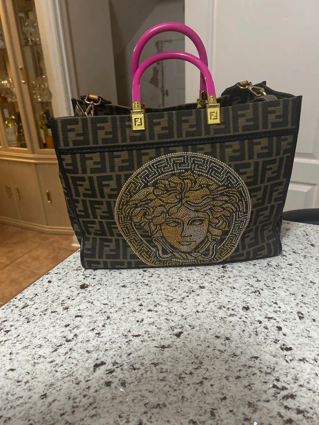 Selling a Fendi x Versace Fendace tote bag. It features the iconic Fendi logo print and the Versace Medusa emblem. The bag has pink handles and a shoulder strap. It's in great condition and ready for a new home! Exclusive**