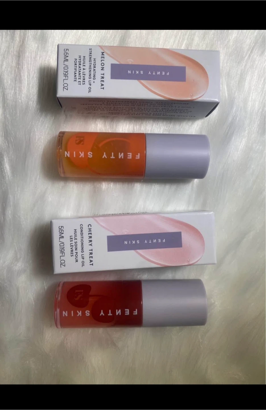 15I have Fenty Skin Conditioning Lip Oil in Cherry and Melon flavours. They are 5.6mL/0.19FL.OZ each. They are hydrating and strengthening lip oils! Porch pick up only