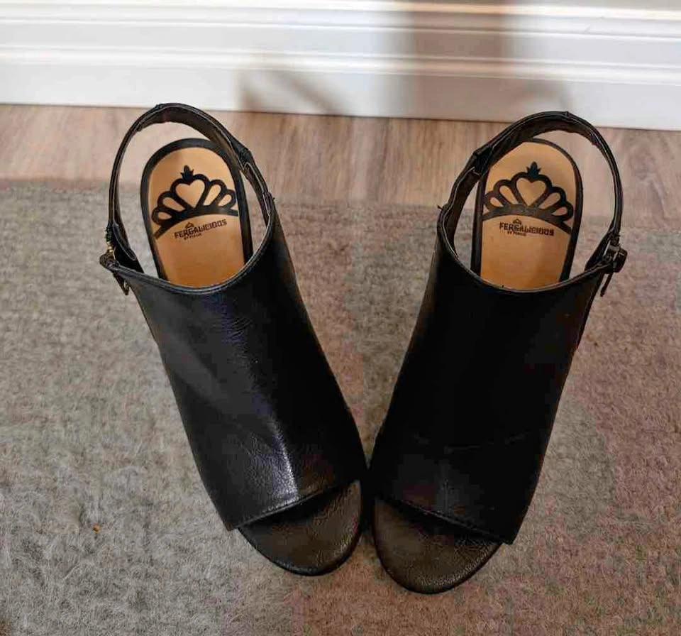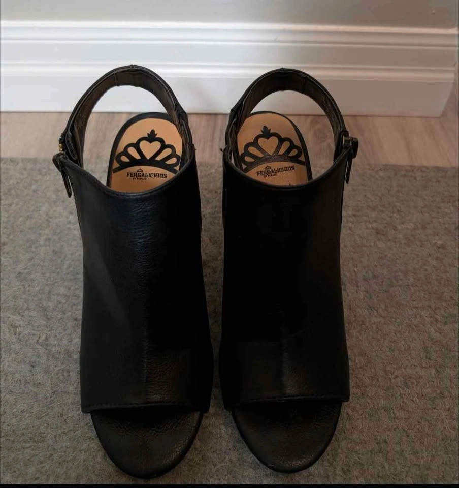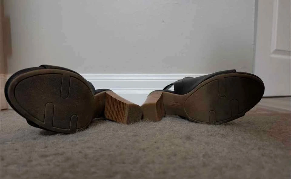 10These are black heeled sandals with a zipper on the side. They are in good condition, like new as they were barely worn. Selling because I'm unable to wear heels.