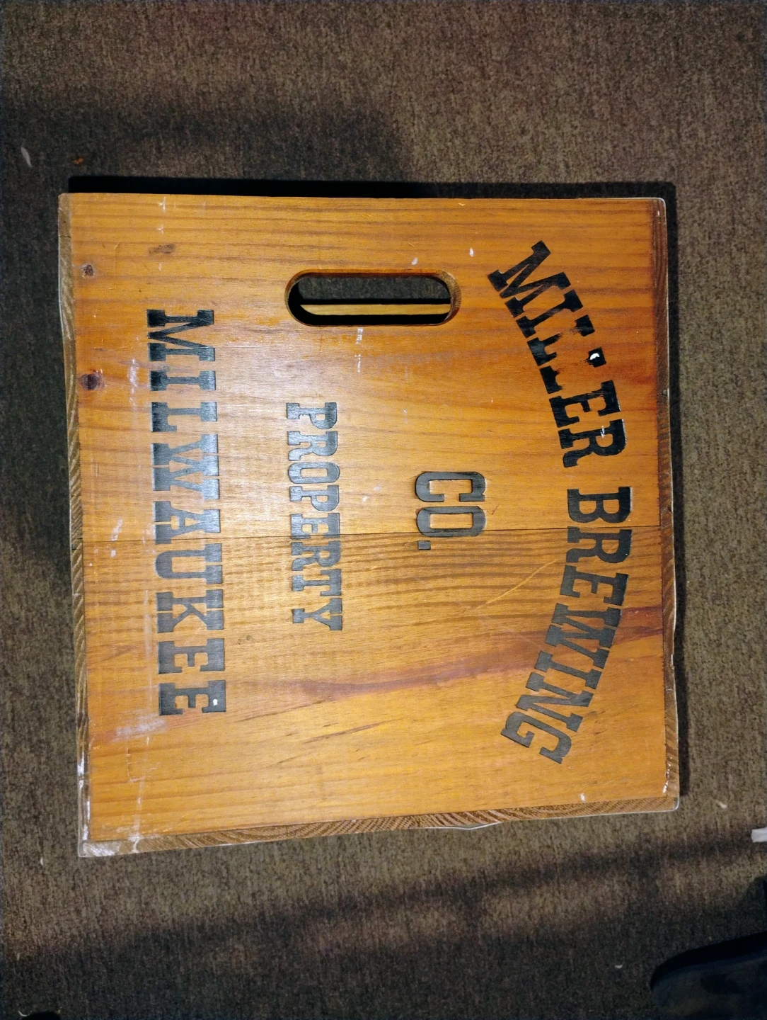 This is a vintage wooden crate from Miller Brewing Company in Milwaukee. It's labeled 'Miller High Life Beer' and features 'The Champagne of Bottle Beer' slogan. The crate has handles on the sides for easy carrying. Great for storage or as a rustic decor piece! Used to transport miller high life beer from 1940-1960