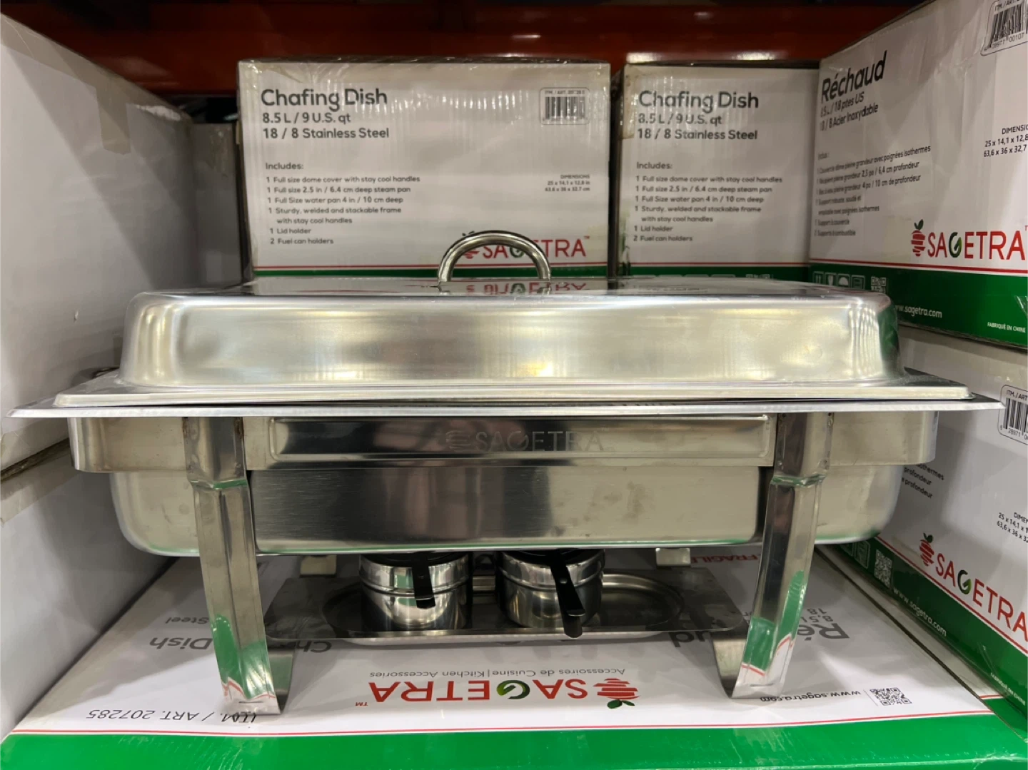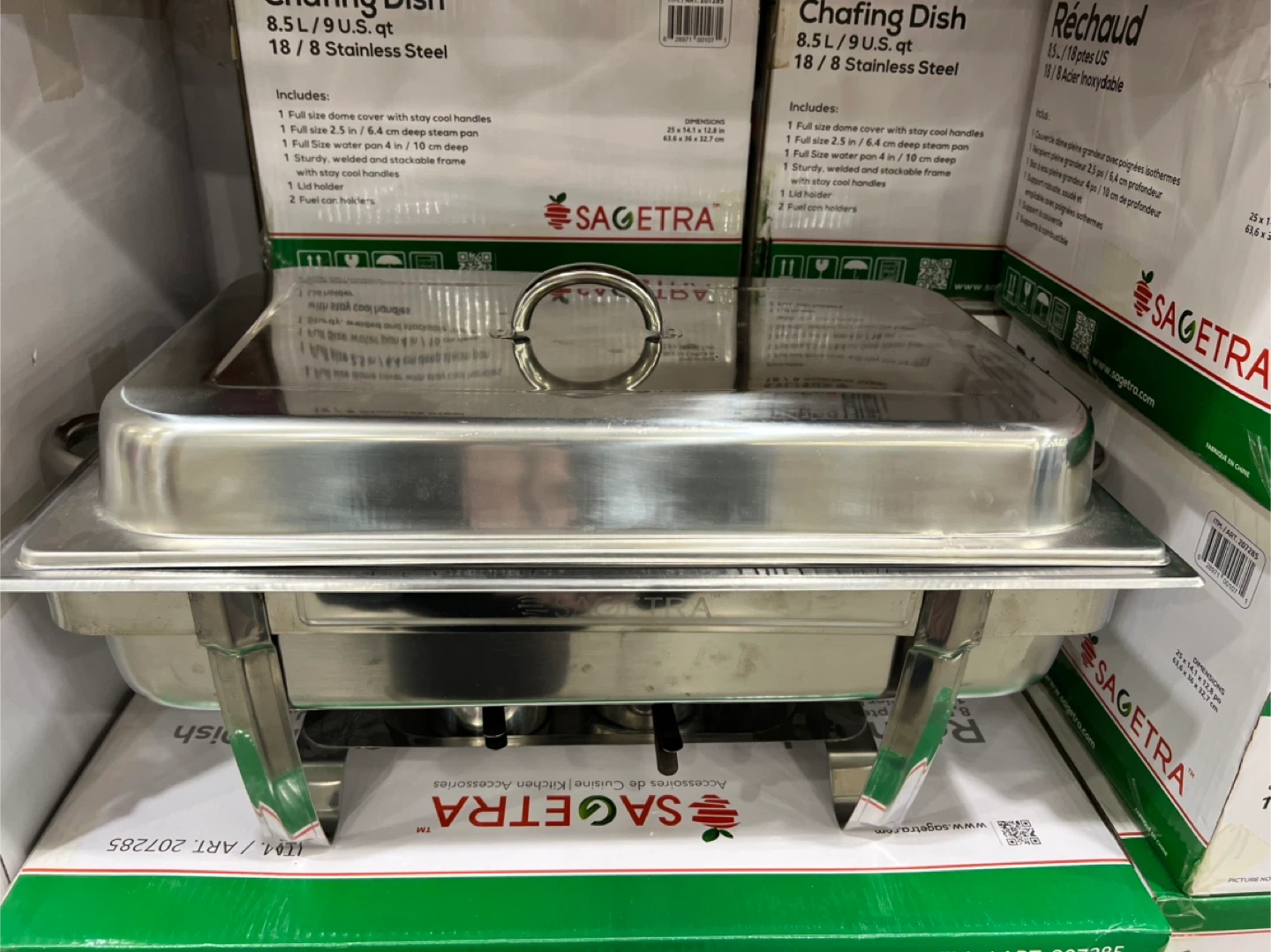 This chafing dish comes with a full size dome cover and a full size water pan. It includes a sturdy, welded and stackable frame. It's made of 18/8 stainless steel and includes a lid holder.