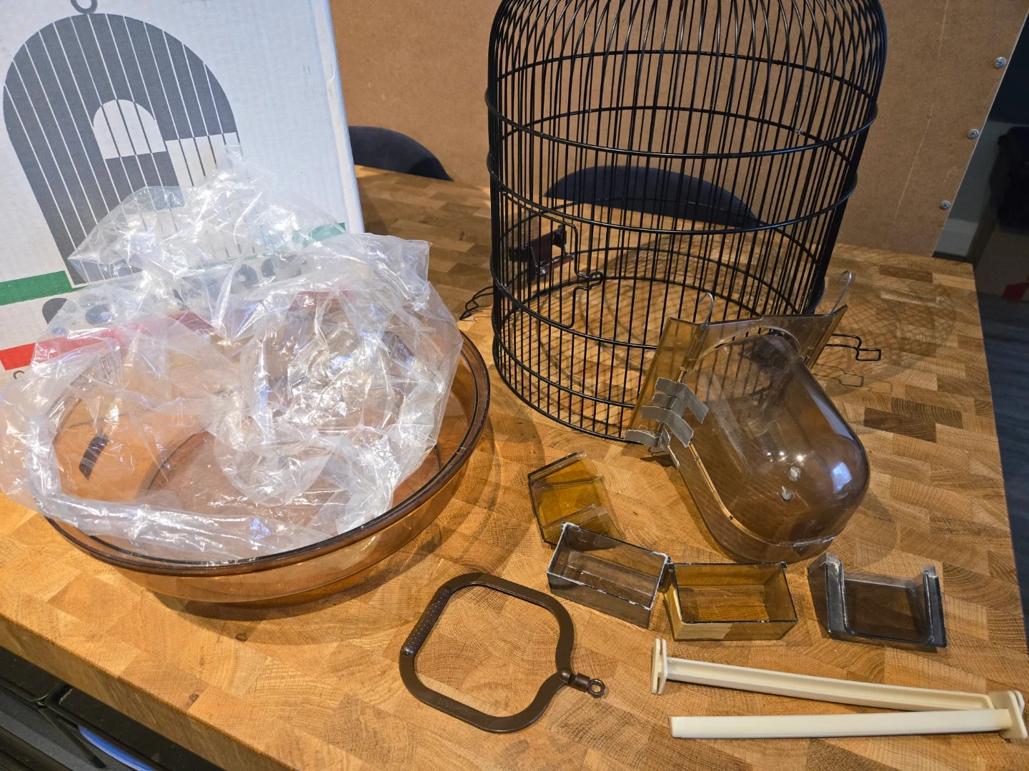 5Selling a Ferplast A58 Lilly bird cage. It comes with all the components pictured and the original box. Some damage to food container but the tape does the trick and is still usable.