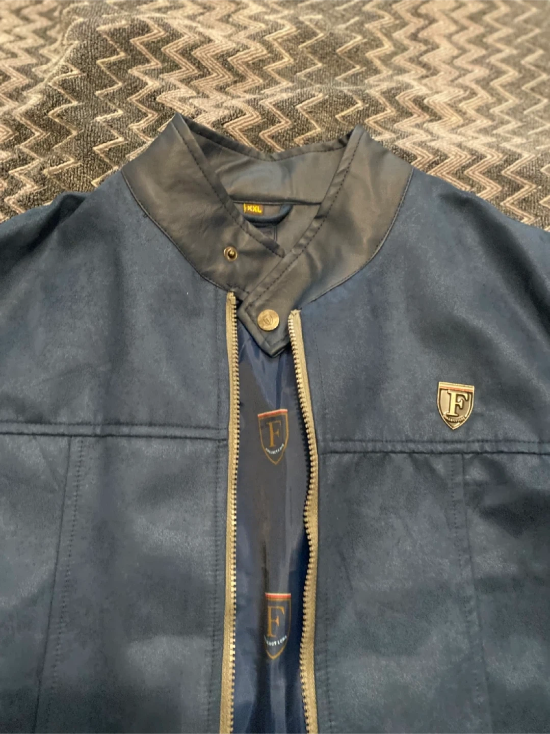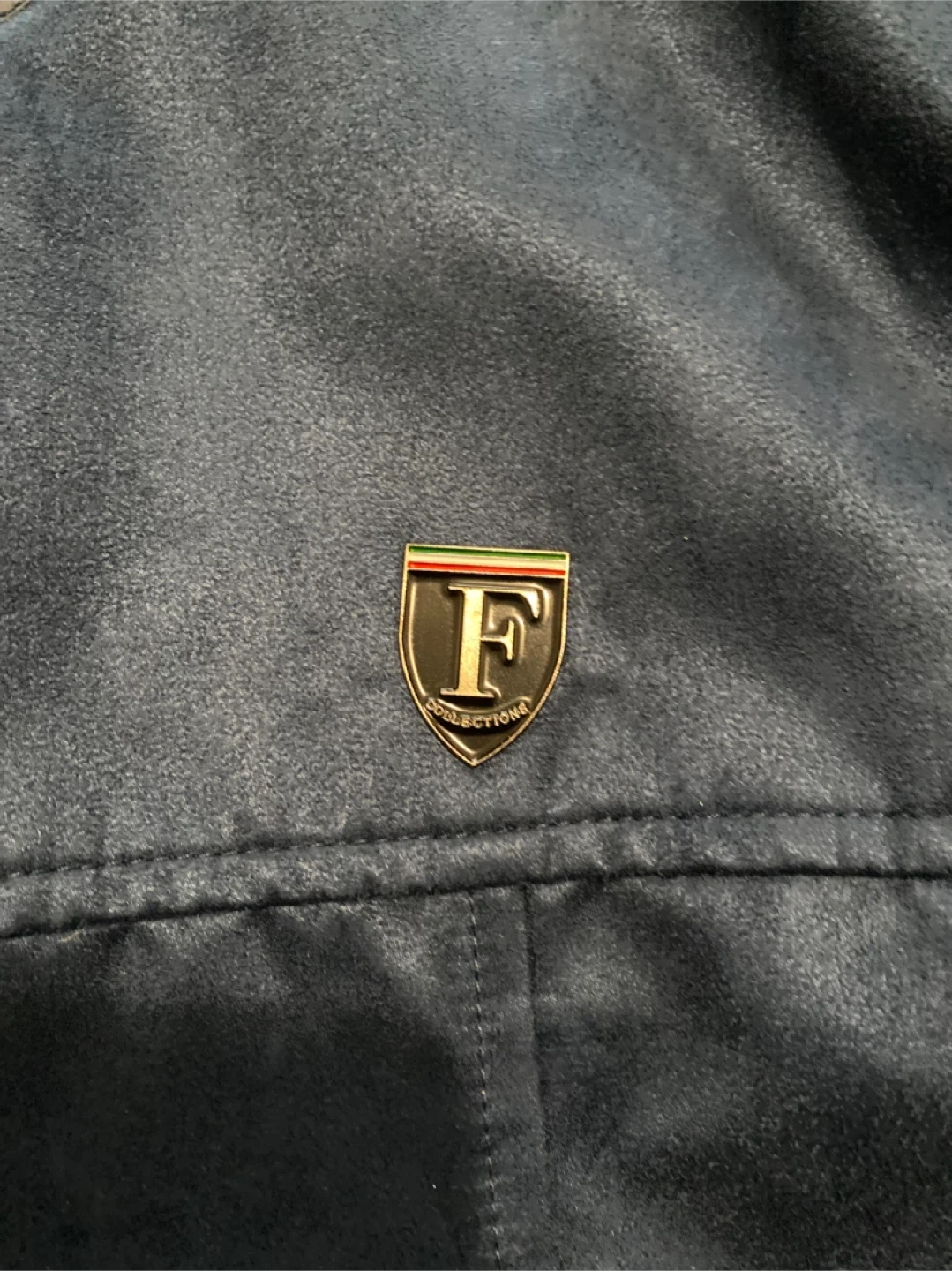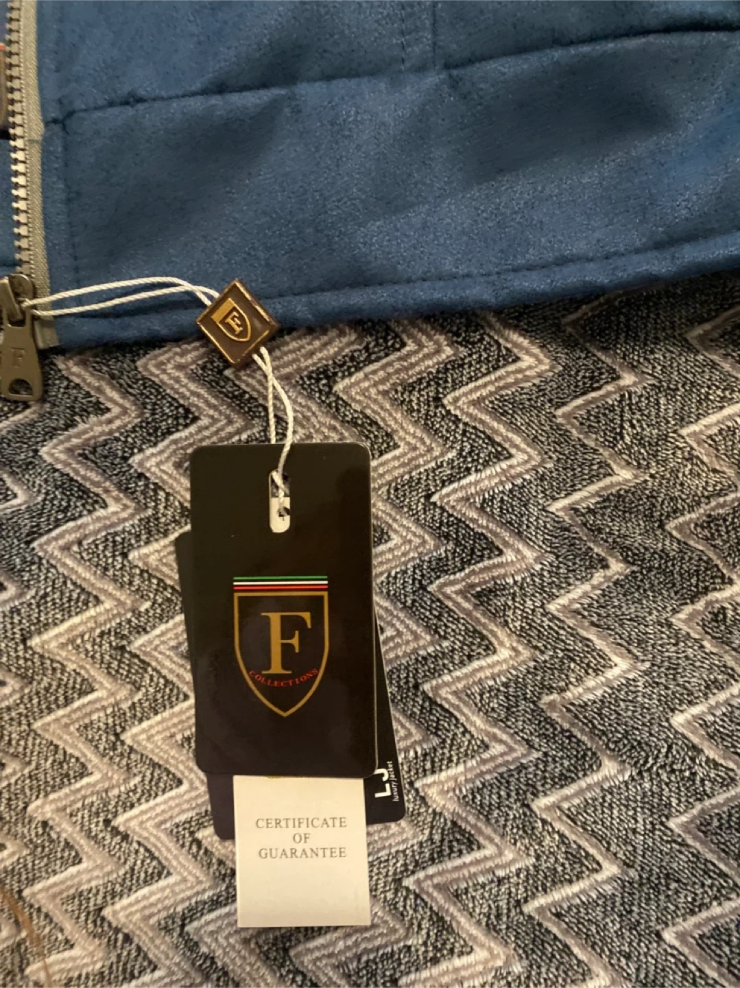 Here's a stylish blue jacket from F Collections! great for any occasion. The material feels nice and it's in excellent condition. Warm great for fall weather! ( LOWEST BEING SOLD 90$ )