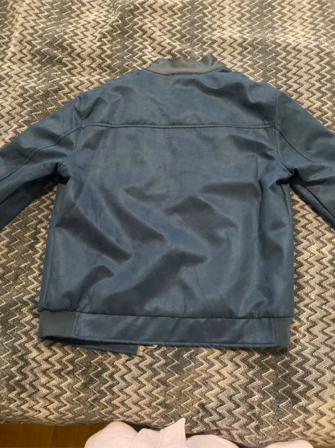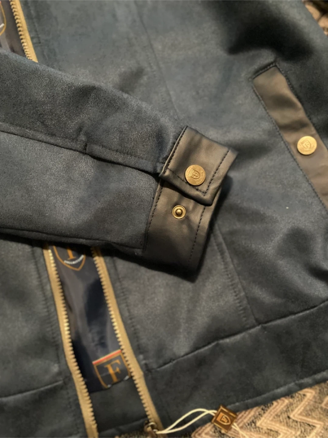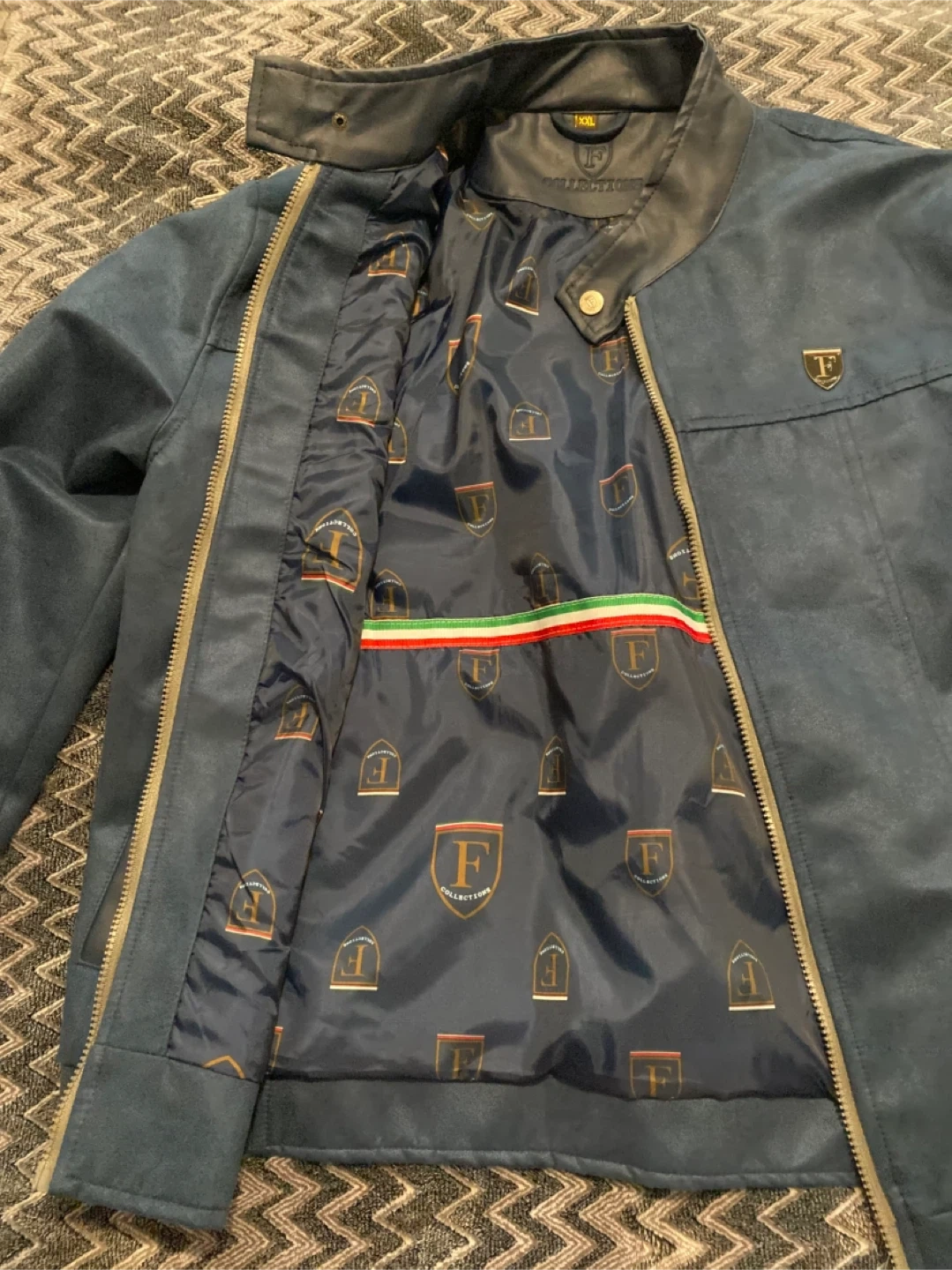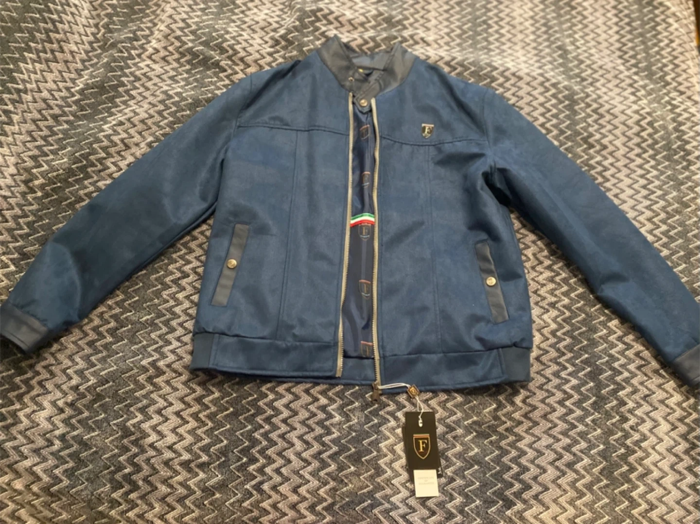 Here's a stylish blue jacket from F Collections! great for any occasion. The material feels nice and it's in excellent condition. Warm great for fall weather! ( LOWEST BEING SOLD 90$ )