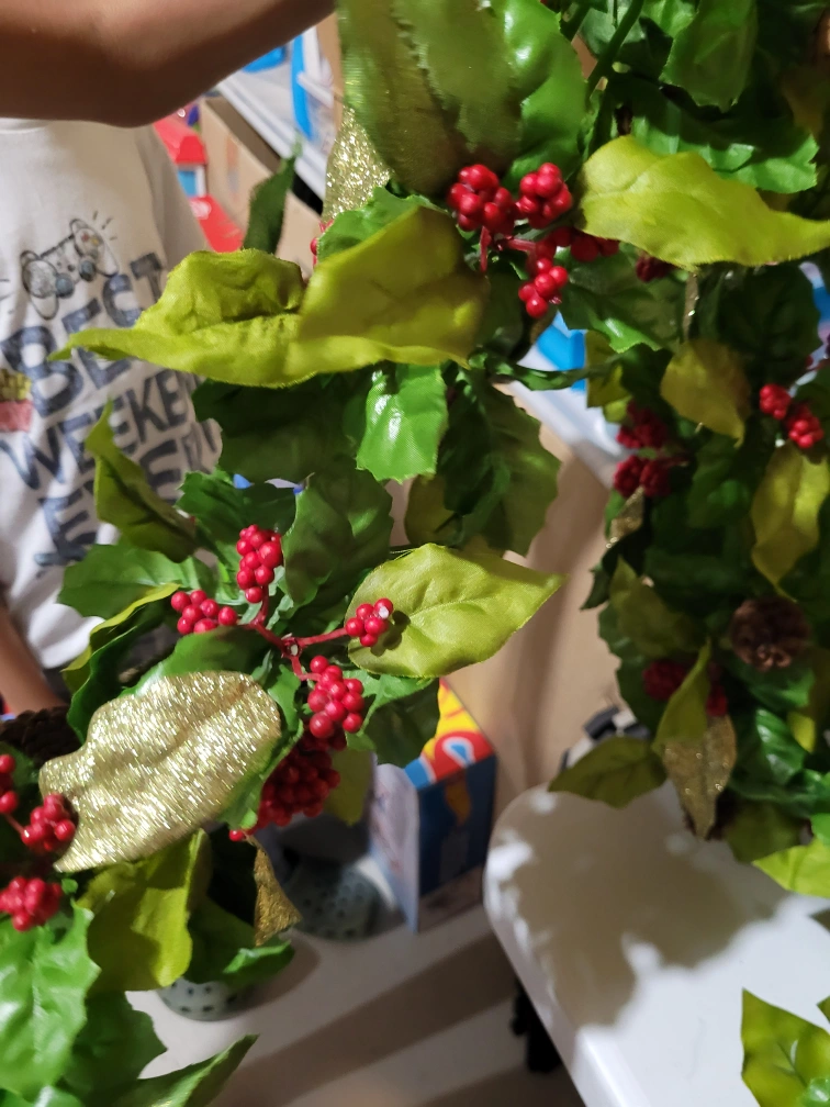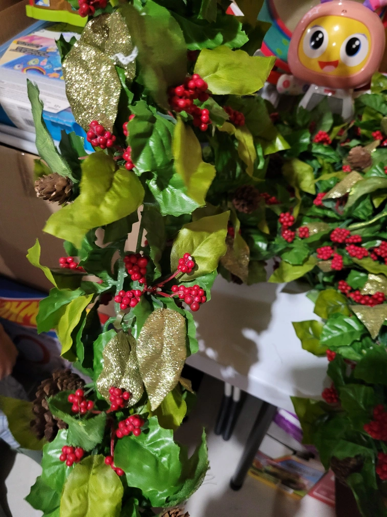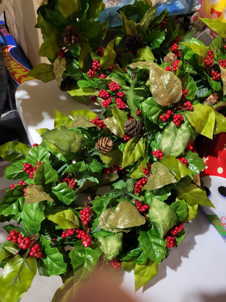 Add a touch of holiday cheer to your home with this festive garland! It features green leaves, red berries, and golden accents. Perfect for decorating your mantel, doorway, or Christmas tree this holiday season.