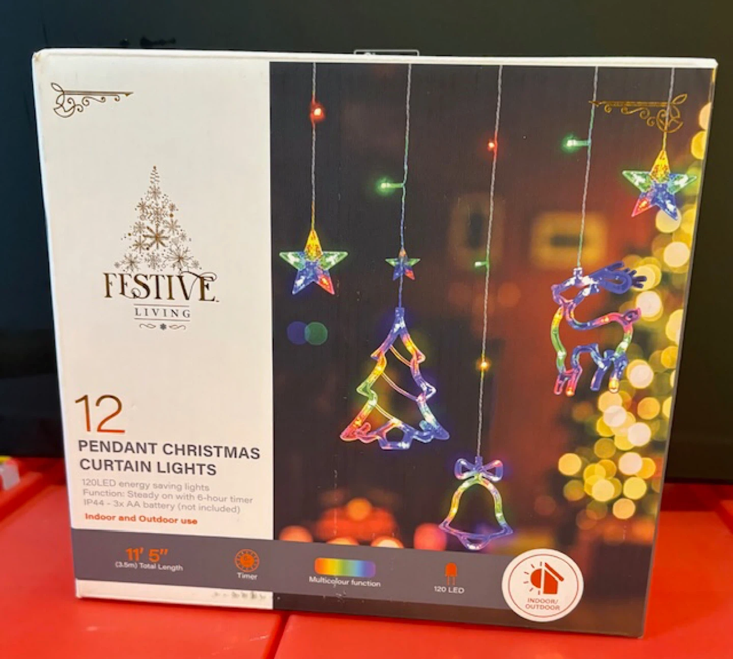 214Get ready for the holidays with these Festive Living 12 Pendant Christmas Curtain Lights! These energy-saving lights feature a steady-on function with a 6-hour timer. They are suitable for both indoor and outdoor use. The total length is 11' 5" (3.5m). Requires 3x AA batteries (not included). 🤩