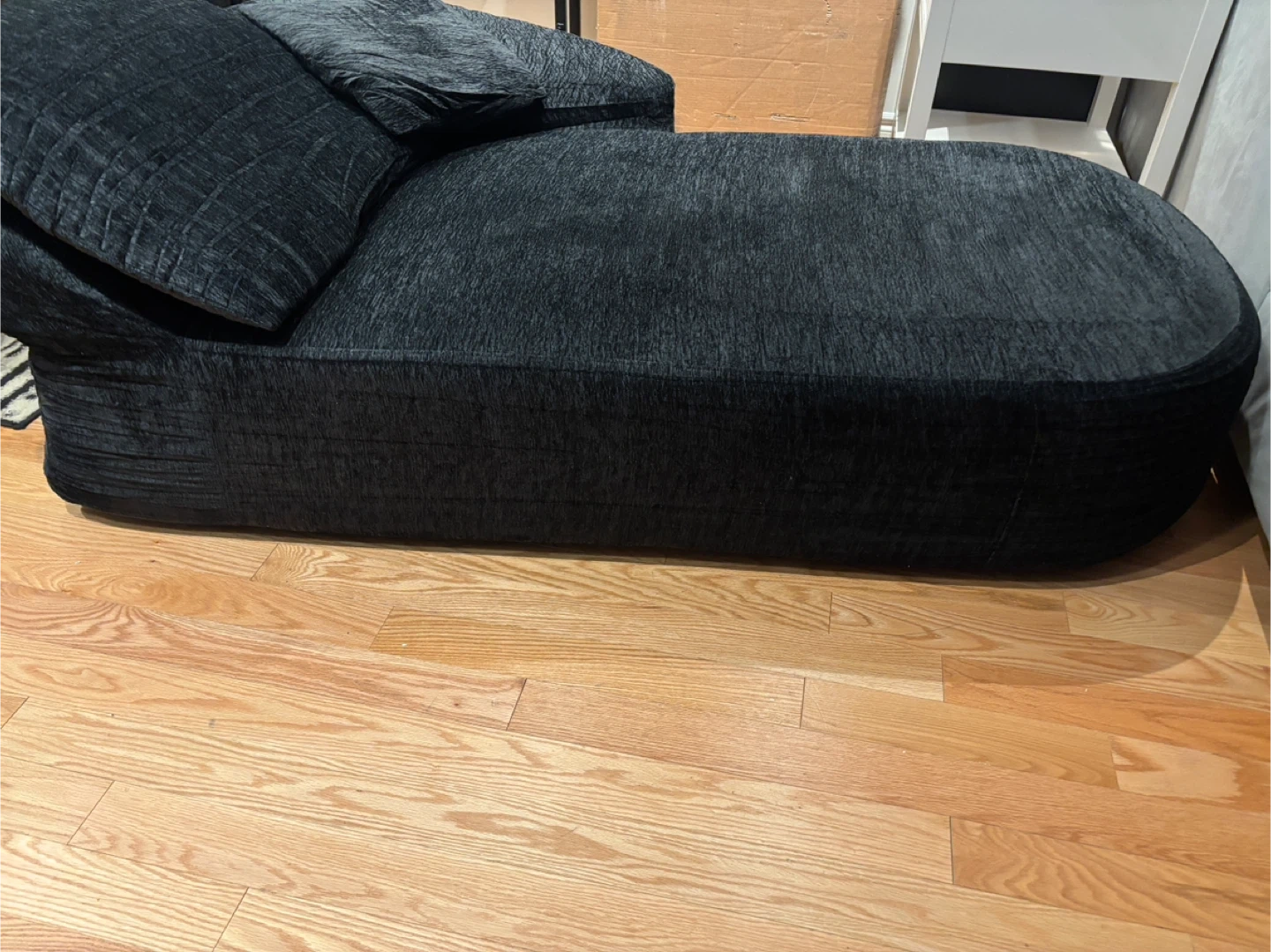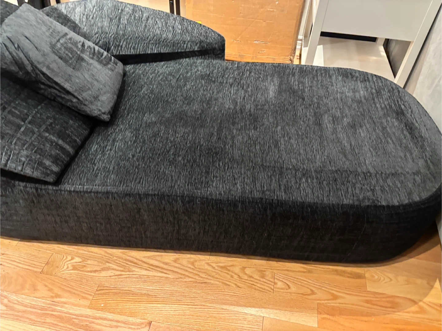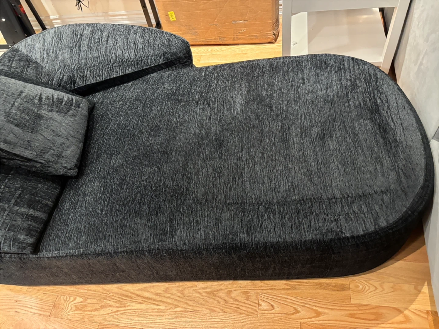 This Black lounge modular is upholstered in a textured dark grey fabric. It comes with two matching throw pillows for added comfort. Its sleek design makes it a stylish addition to any living space. Great for relaxing or reading!