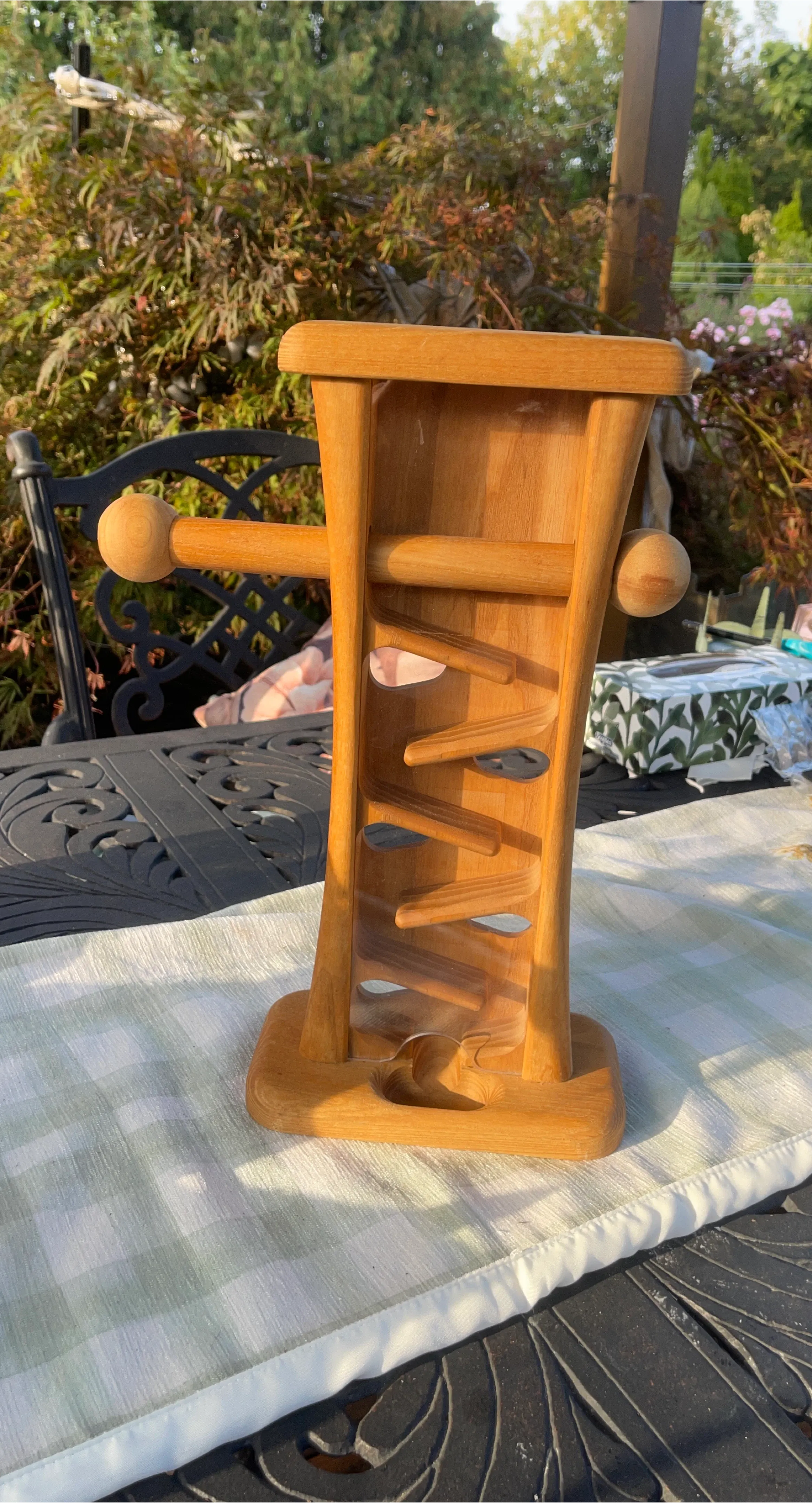 Selling a vintage wooden marble tower toy! It's in great shape and ready for a new home. This classic toy is sure to provide hours of fun for kids of all ages. The tower is made of wood and features a series of ramps and holes that marbles can roll down. A great addition to any playroom or toy collection!