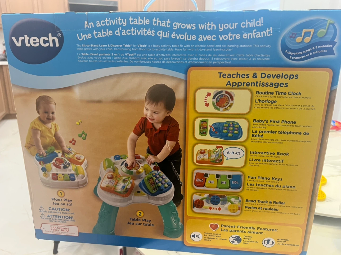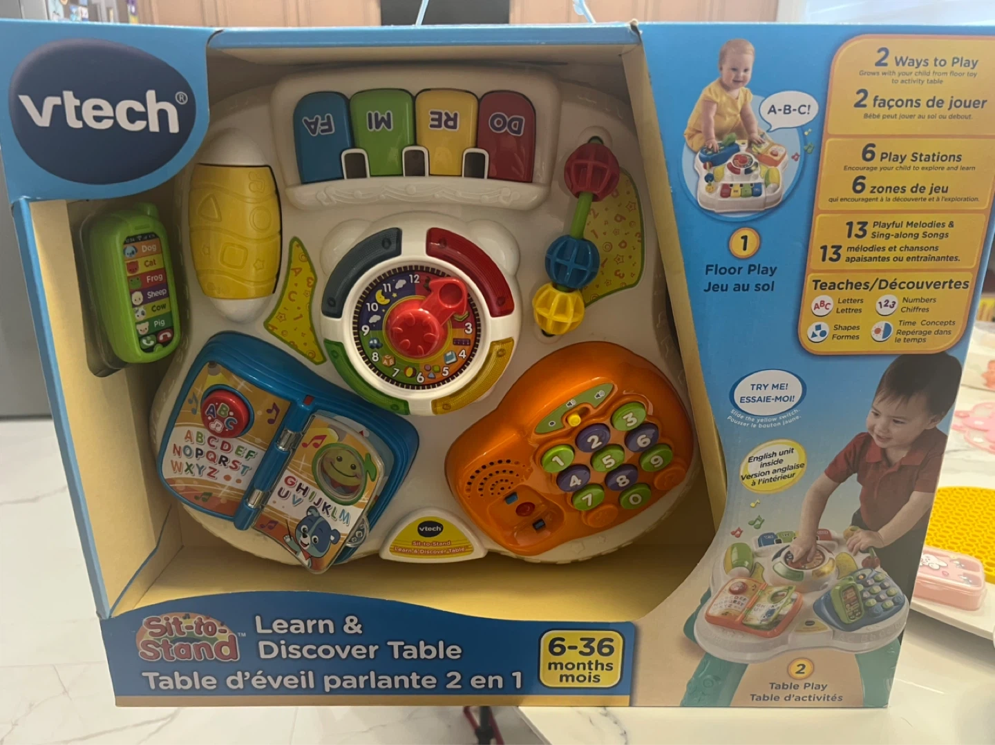 This VTech activity table grows with your child, transforming from floor to activity table. It has 6 learning stations with 2 ways to play. Recommended for ages 6-36 months.