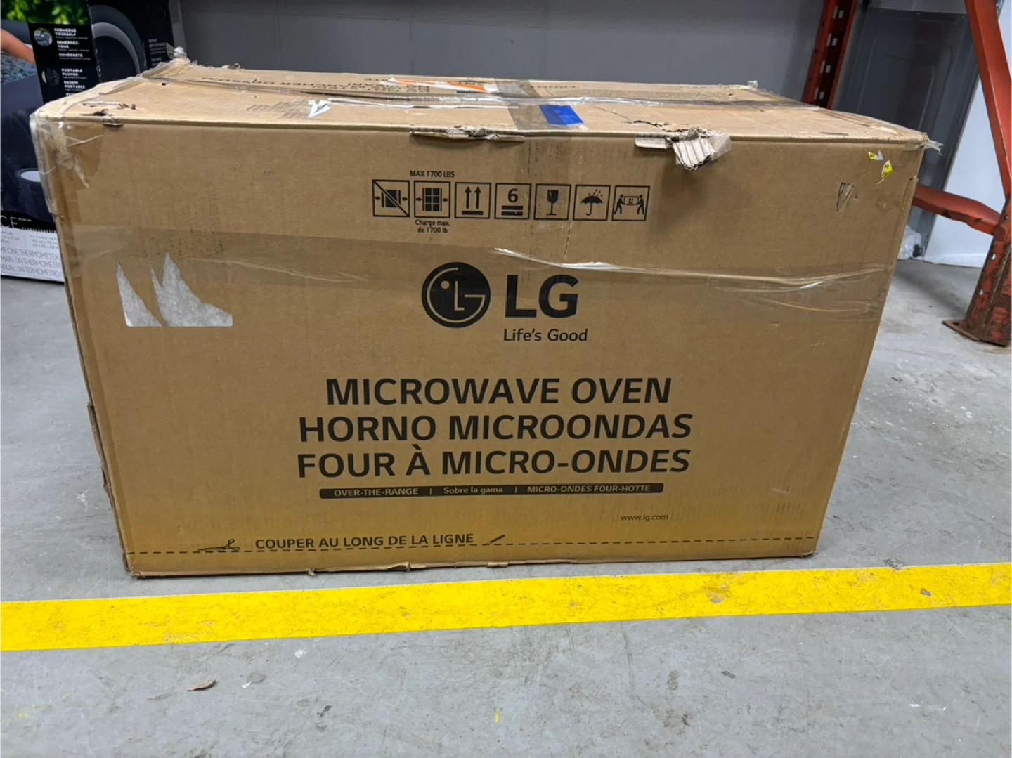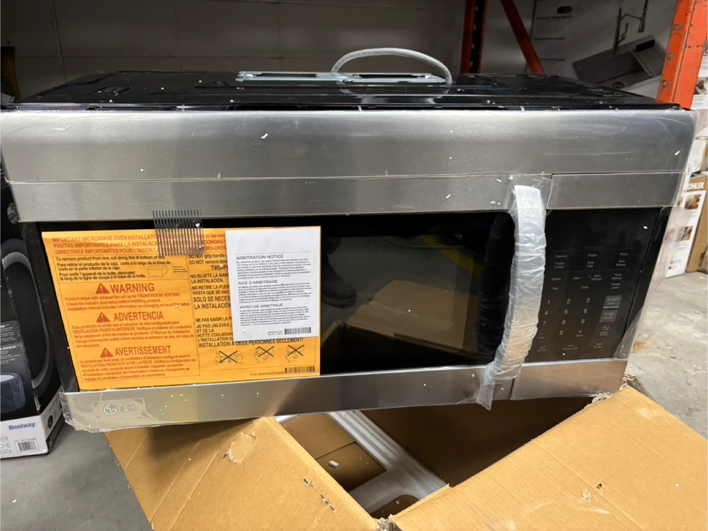 LG stainless steel over-the-range microwave oven. Includes vent fan and installation accessories. Stainless steel finish.