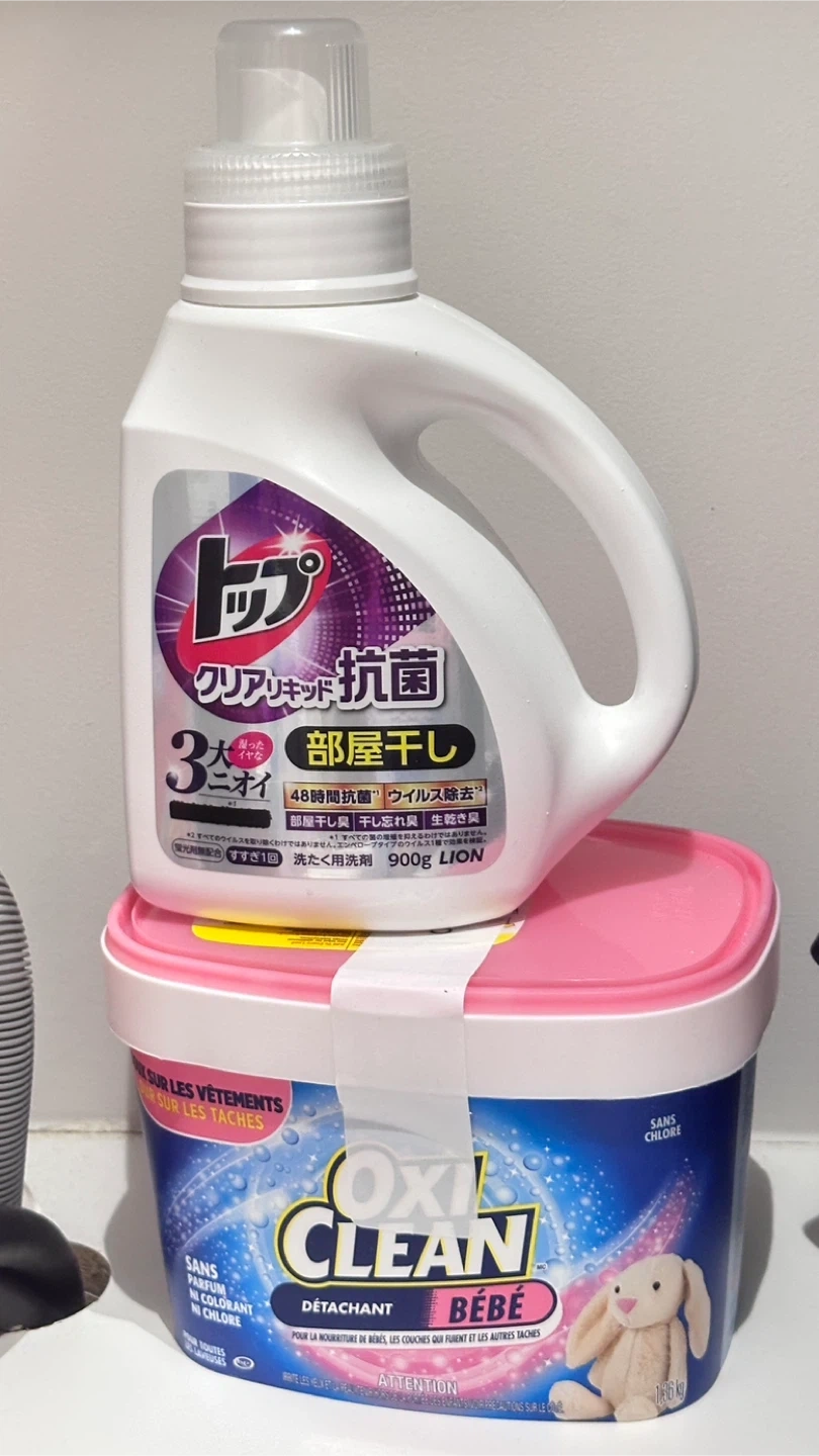 All new and unopened, clear liquid laundry detergent with antibacterial and antiviral properties that last for 48 hours and Oxi Clean Baby stain remover