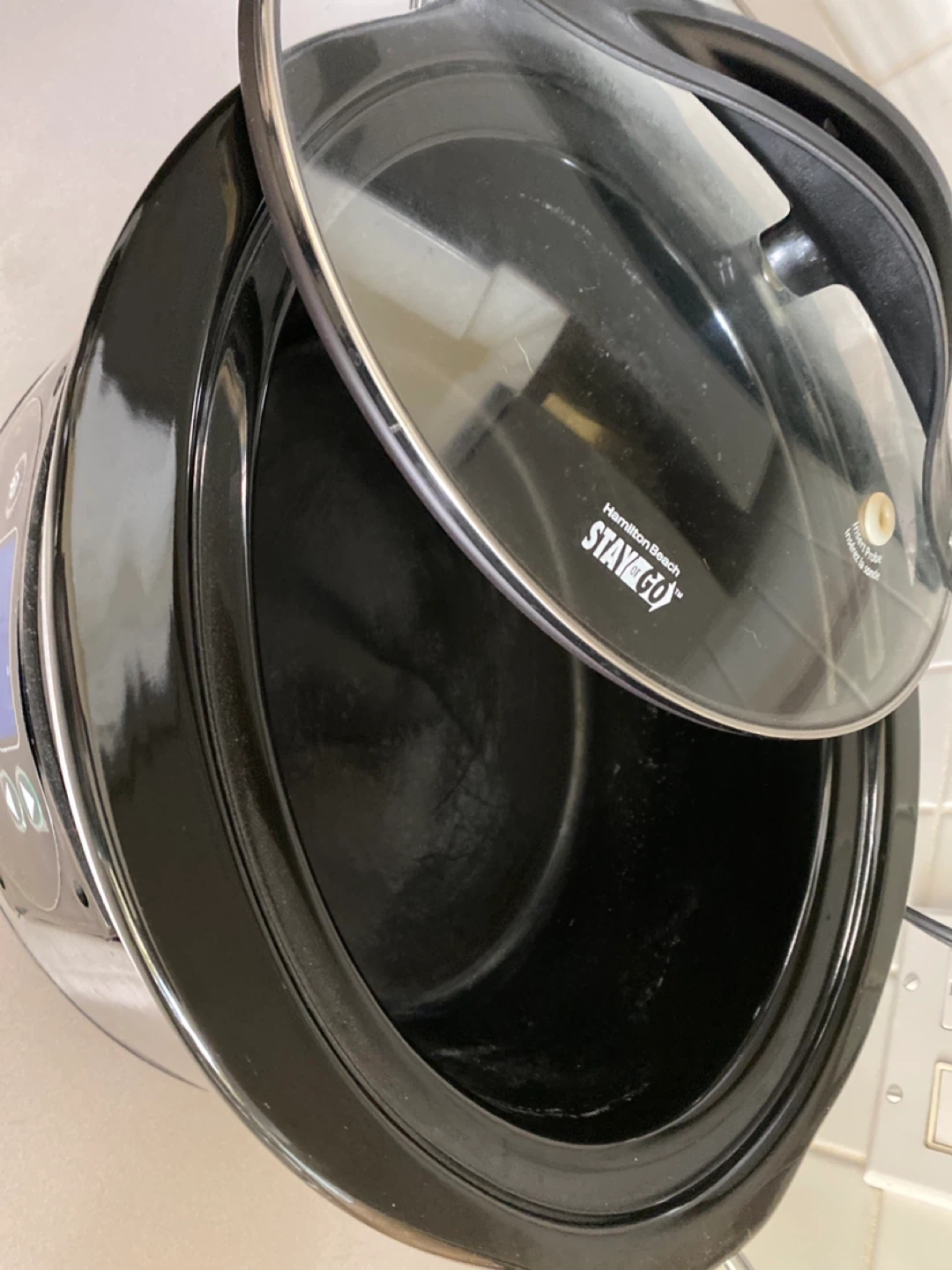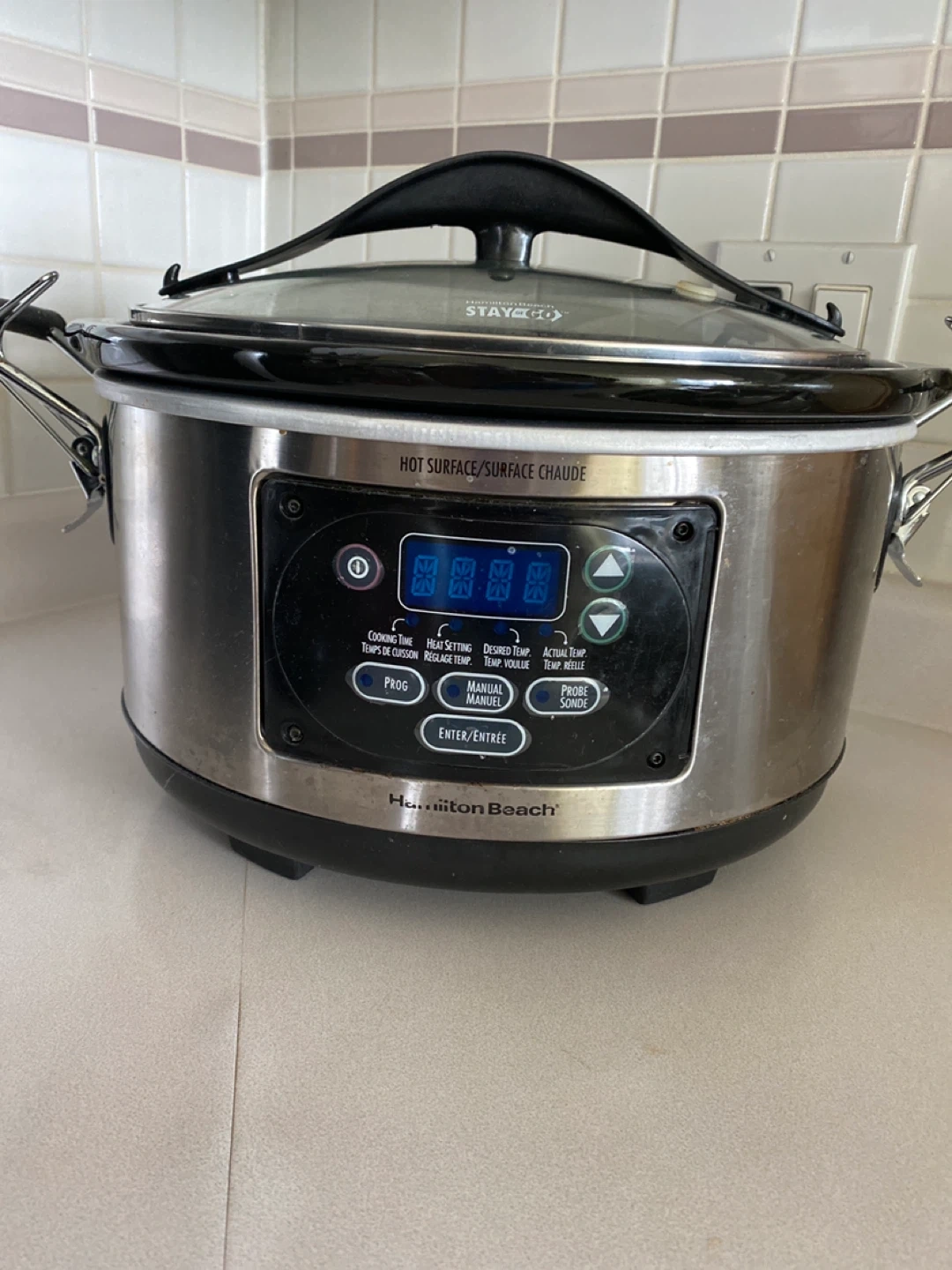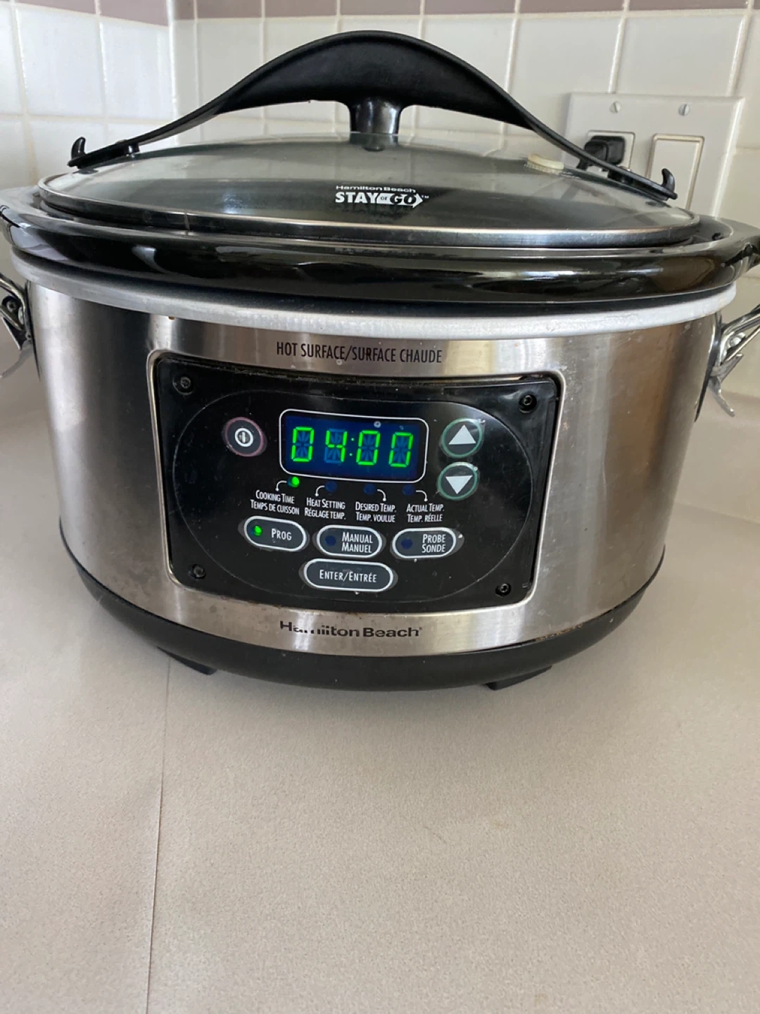 This is a Hamilton Beach slow cooker with a black exterior. It features digital controls for easy setting of cooking time and temperature. The glass lid allows you to monitor your food while it cooks.