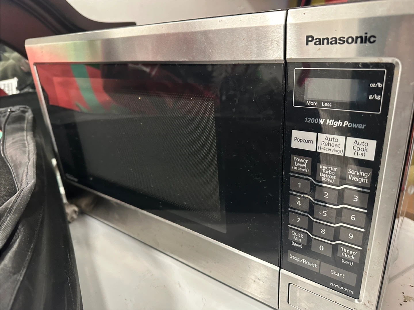 Panasonic 1200W High Power microwave. Features include "Popcorn", "Auto Reheat", "Auto Cook", "Power Level (10 Levels)", "Inverter Turbo Defrost", and "Serving/Weight" options. It also has "Quick Min" and "Timer/Clock" functions. Stainless steel exterior.