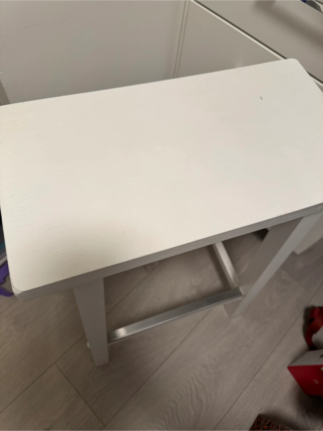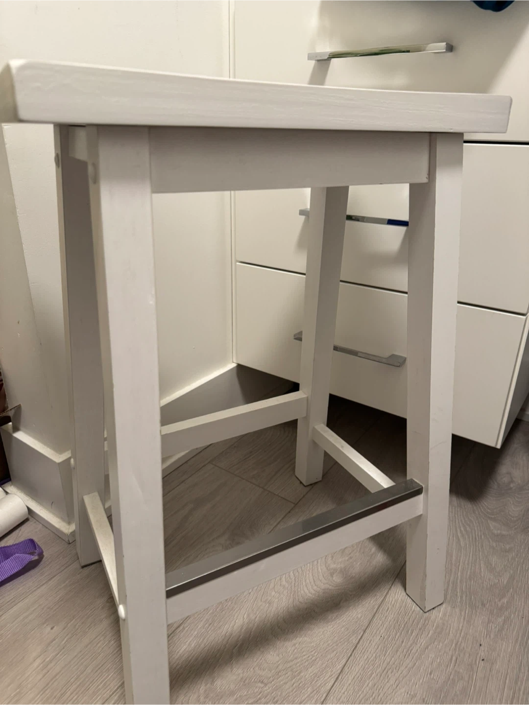 White wooden bar stool with a metal footrest. It has a sturdy build and a simple design. This stool's compact size makes it handy for smaller spaces.