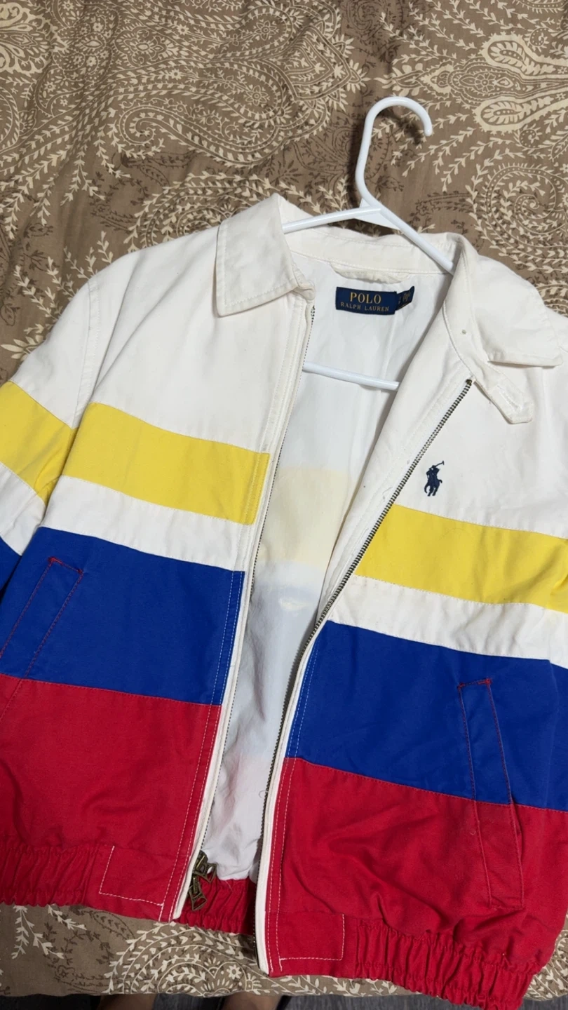 Here's a Polo Ralph Lauren jacket featuring a fun colour block design with white, yellow, blue, and red. It's perfect for adding a pop of colour to your wardrobe!