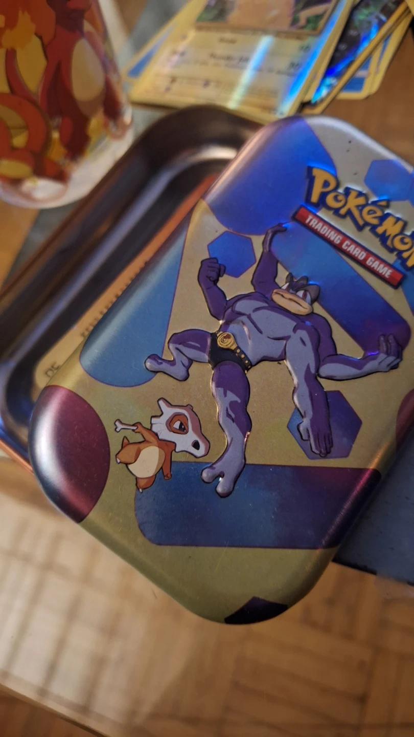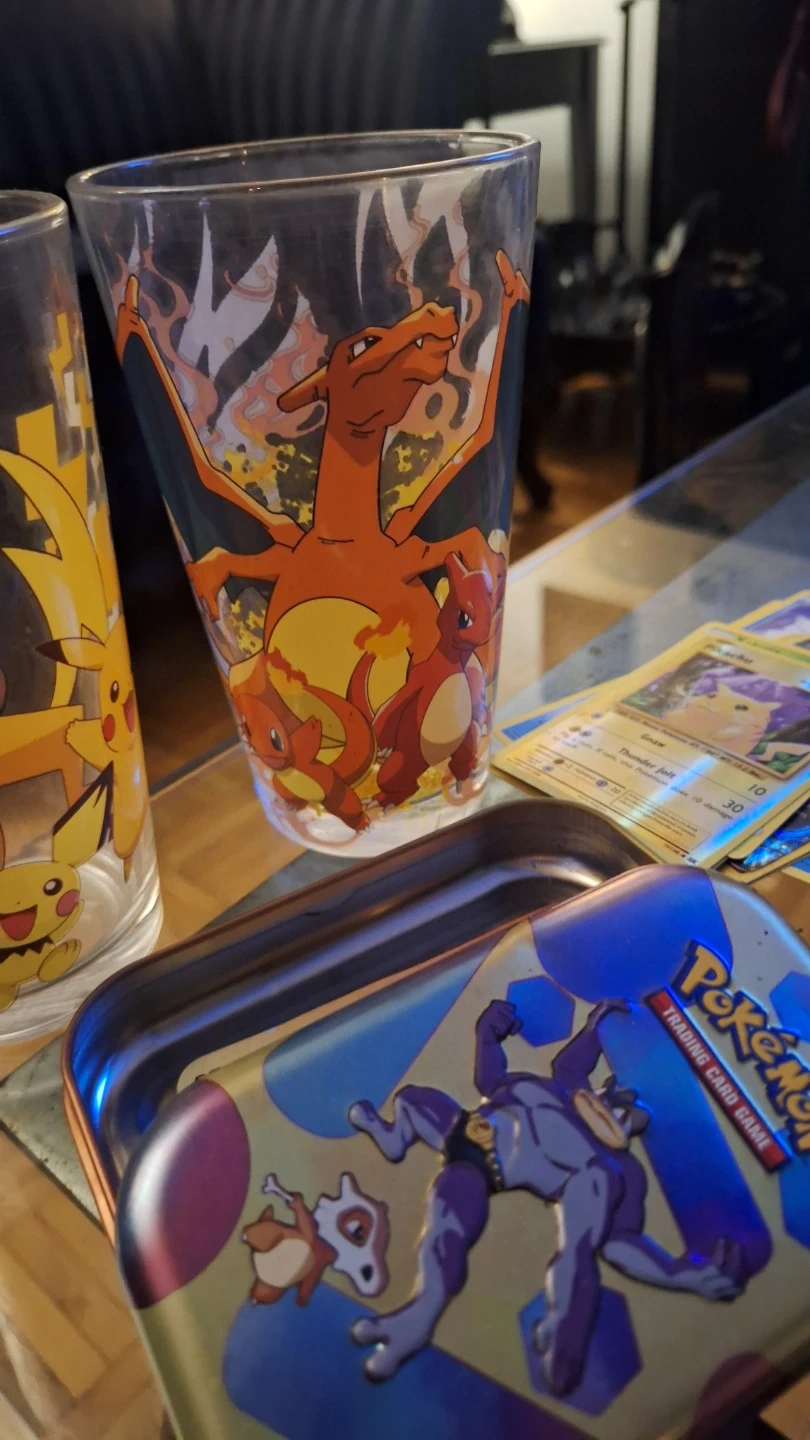 Set of two Pokemon glasses featuring Charizard and Pikachu. Also includes a Pokemon trading card tin. Great for any fan of the series! And cards