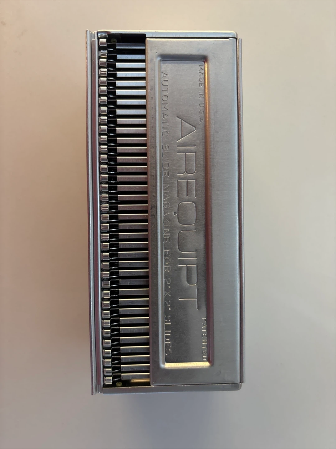 Vintage Airequipt automatic slide magazine for 2x2 slides. The magazine holds 36 slides and comes with the original box. Qty. 12, $2 each.