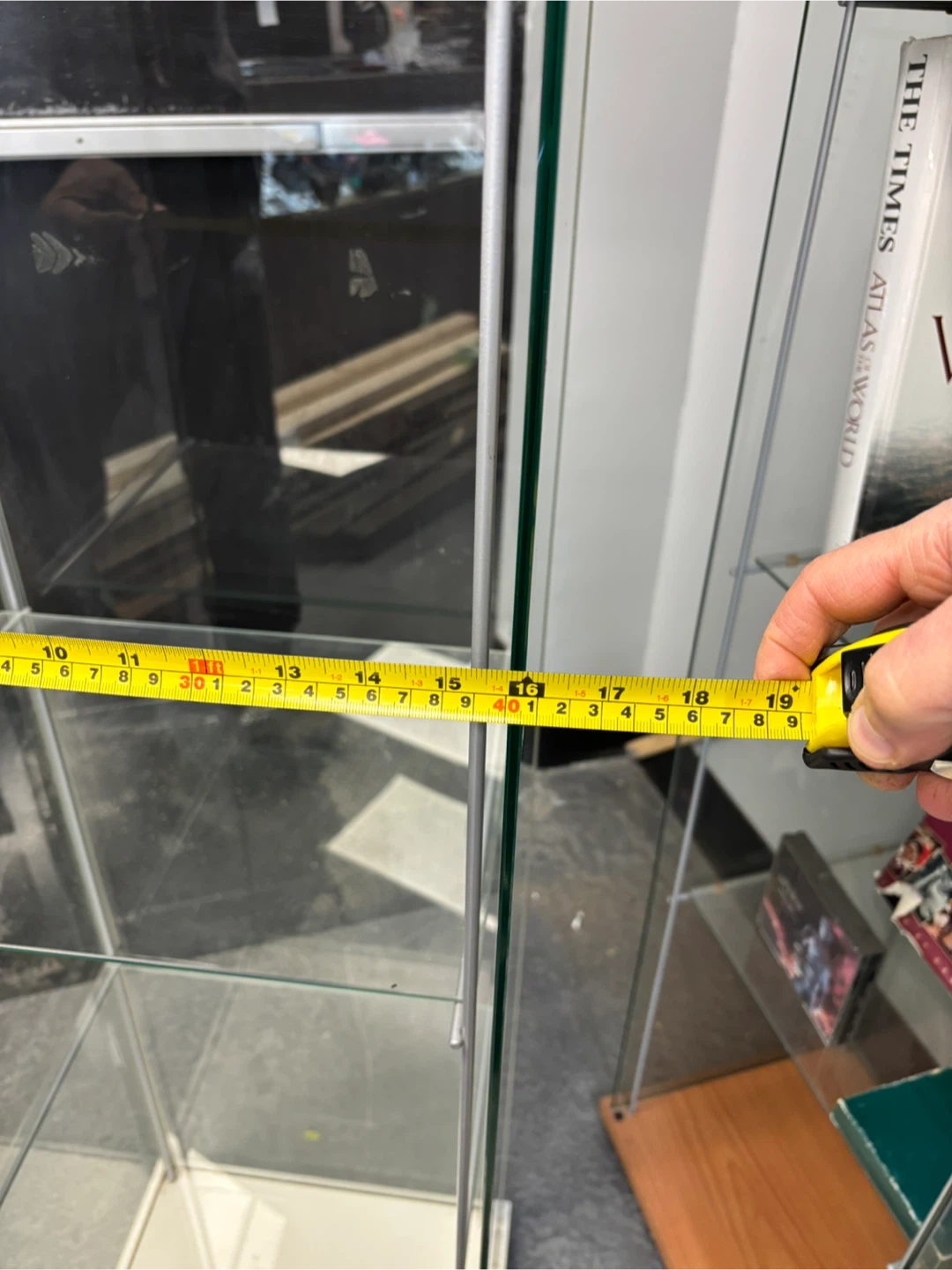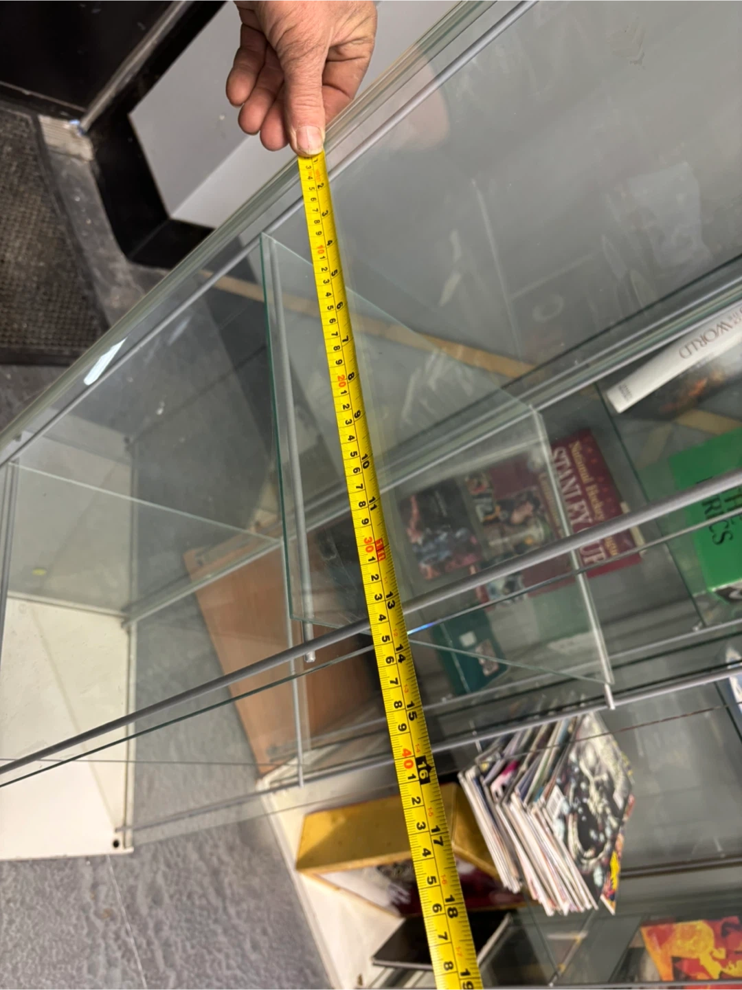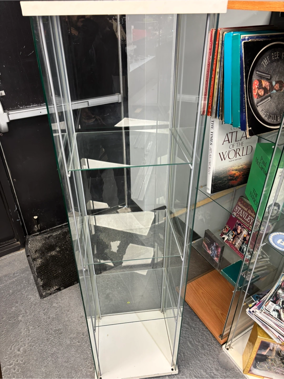 This is a tall glass display cabinet. It has four glass shelves and a white top and base. It's about 63 inches tall. This cabinet is great for showcasing collectibles or merchandise!