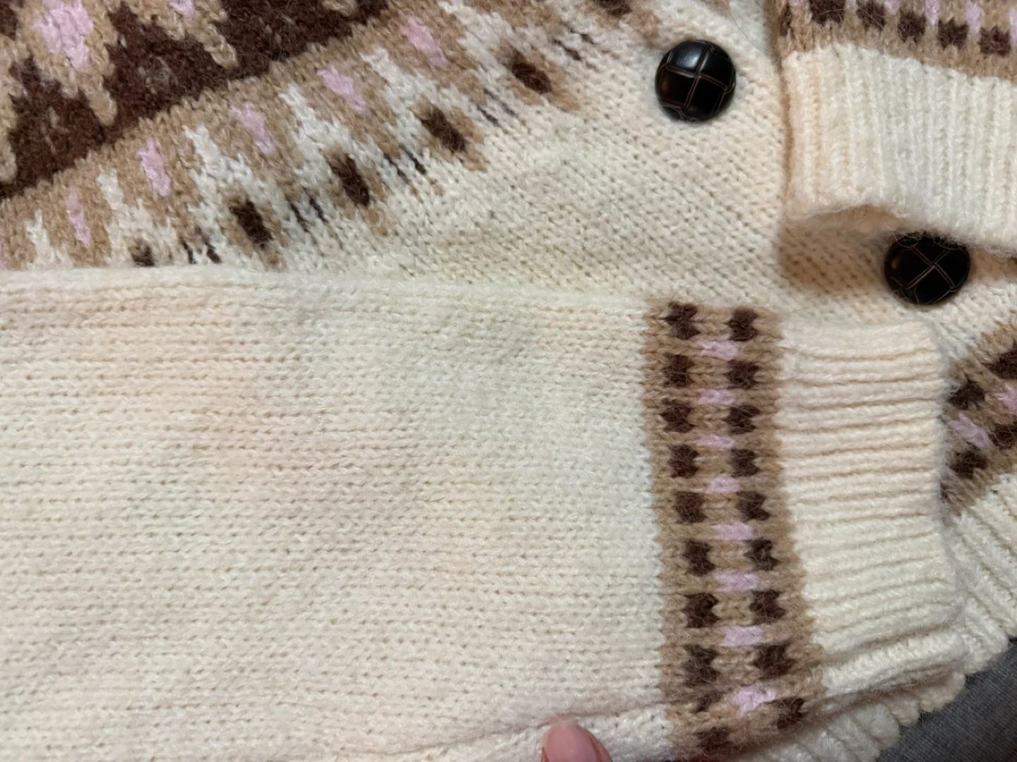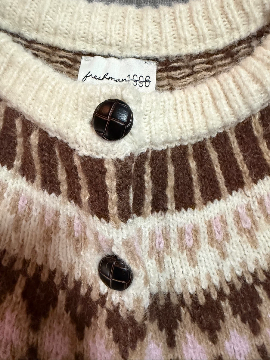 Cream knit cardigan with a brown and pink Fair Isle pattern. It has a button-up front and long sleeves. There are some faint marks on the left sleeve.