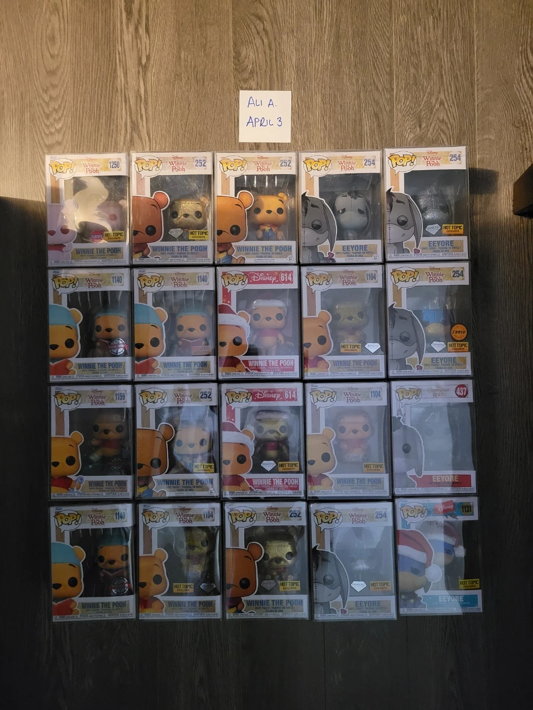 Funko Pop! vinyl figures featuring characters from Disney's Winnie the Pooh. Includes various figures of Winnie the Pooh and Eeyore. Most are Hot Topic exclusives.