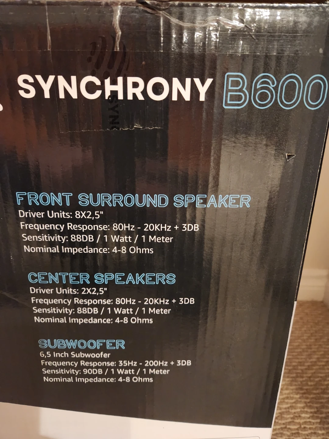 Brand new still in the box Synchrony B600 Home theater speakers. 1500 watt. Worth $3k. Complete set of 5 speakers and subwoofer.