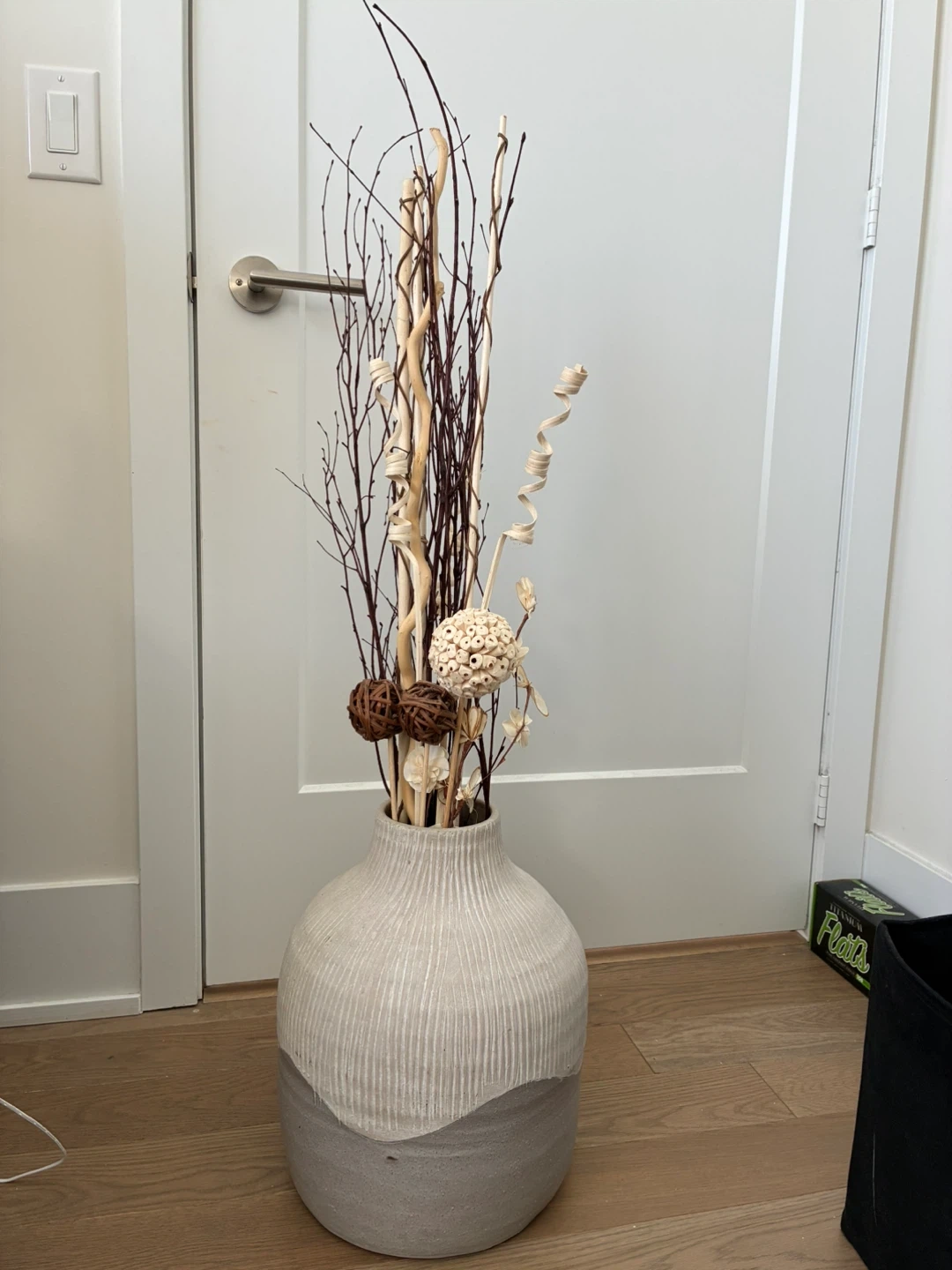 This is a large ceramic vase with a two-tone grey and beige finish. It comes with a generous arrangement of dried decorative stems and natural elements. The vase has a textured ribbed design on the upper portion. It's a nice accent piece for any room!