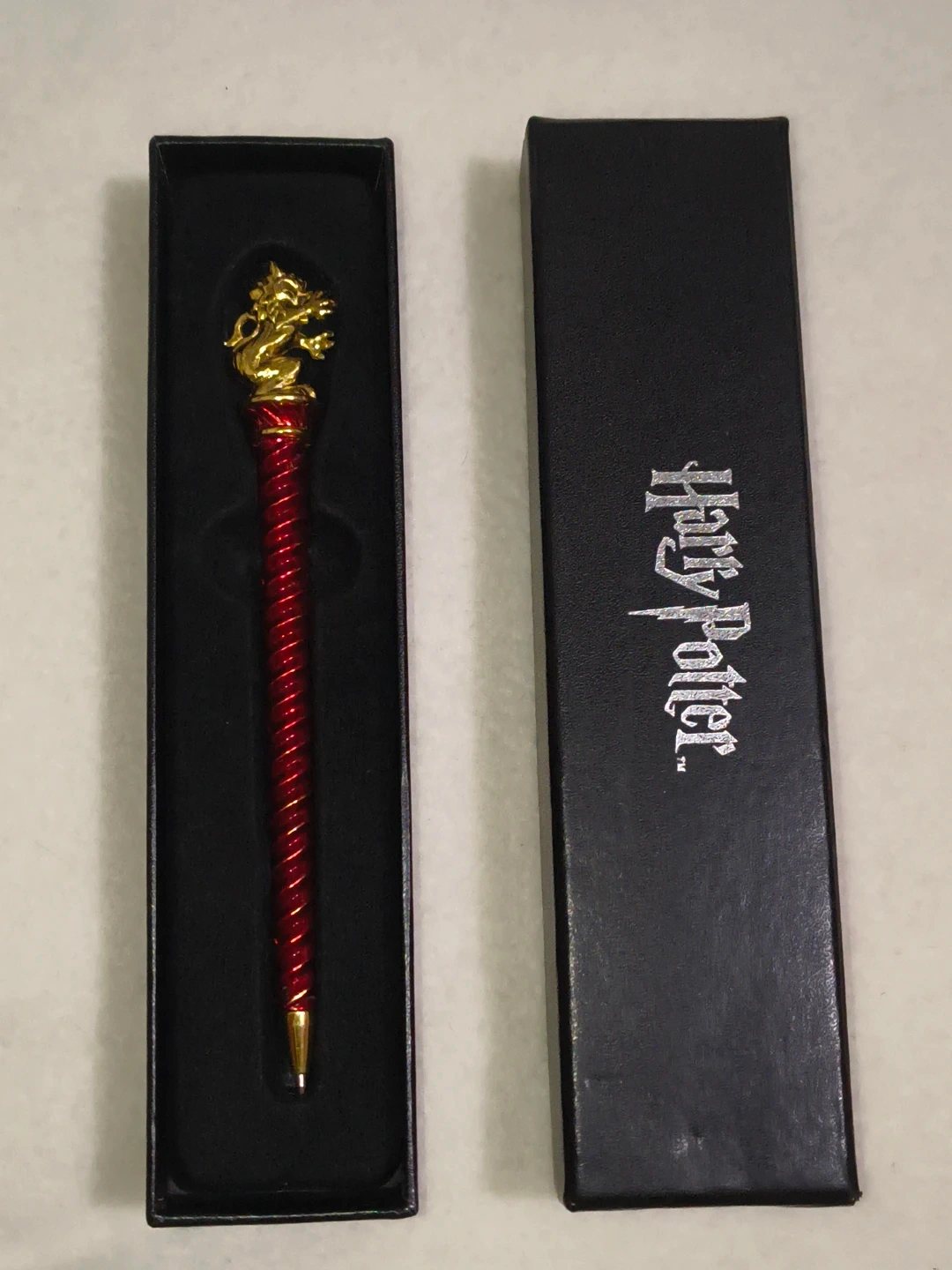 Official Warner Bros licensed Harry Potter novelty pen with gold dragon topper and red spiral shaft. Comes in original Harry Potter presentation box.