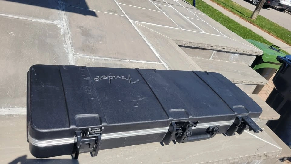 This guitar case features an ATA molded military-grade polyethylene outer shell, a custom-fit EPS protective foam interior with polyester plush lining, and an extended reach neck cradle. It includes a TSA-approved locking center latch, surface-mounted impact diversion latch housing with a release trigger, an ergo-grip injection molded handle, and rugged injection molded polyethylene feet. It fits most Stratocaster and Telecaster electric guitars. This case is $350 + tax new.