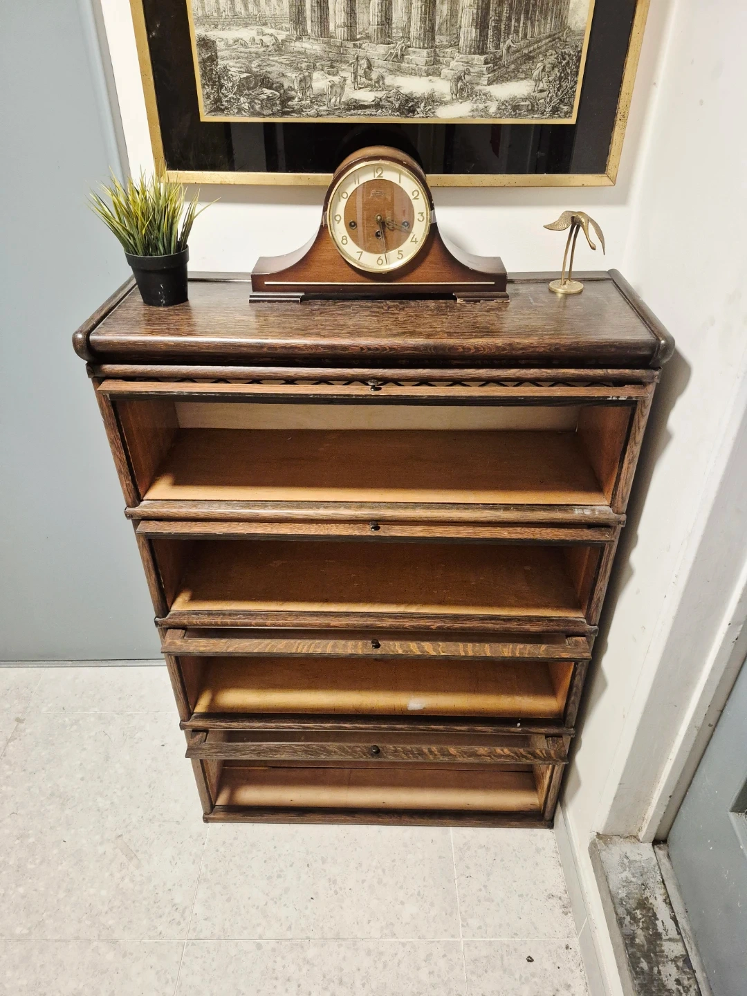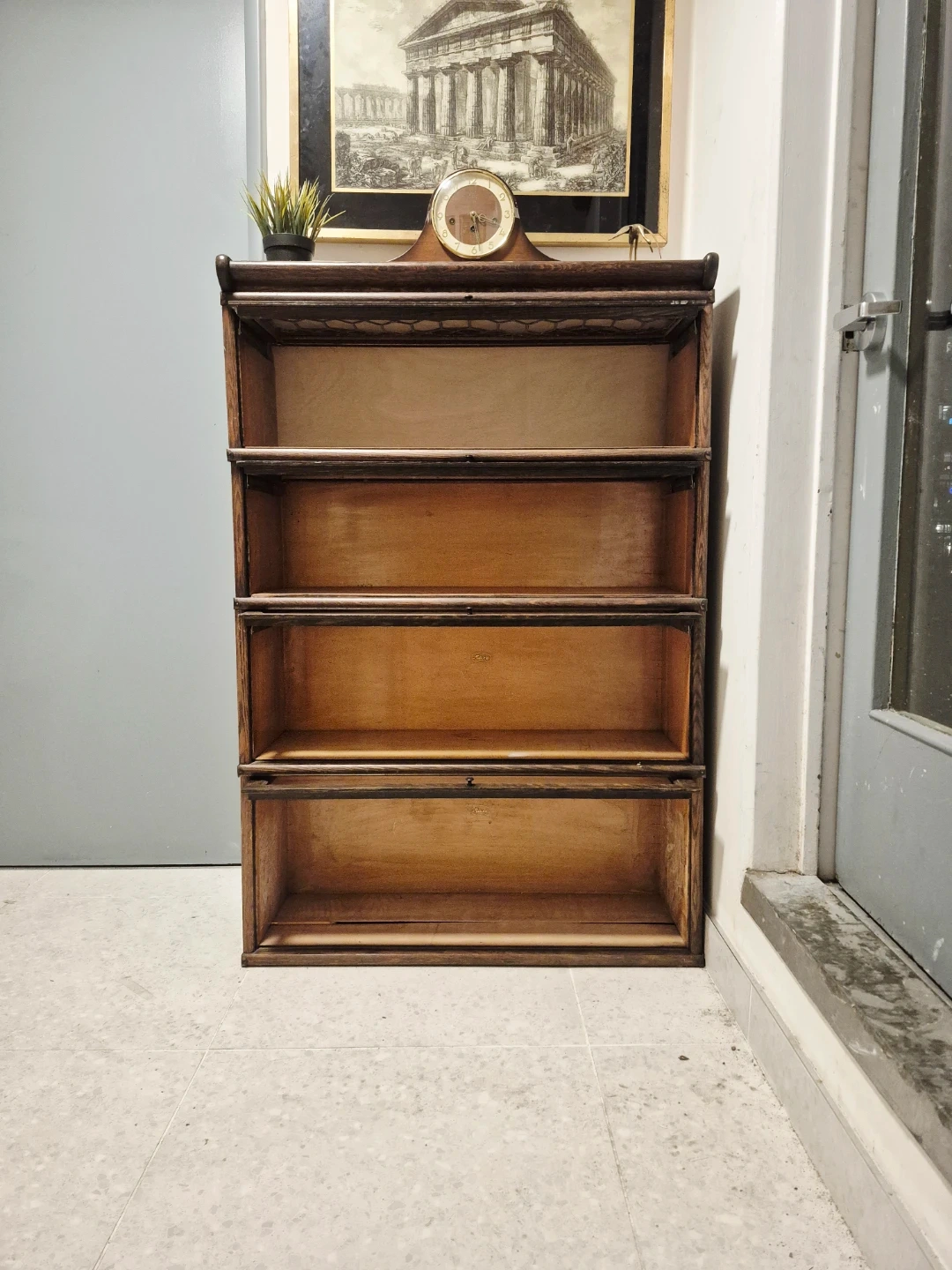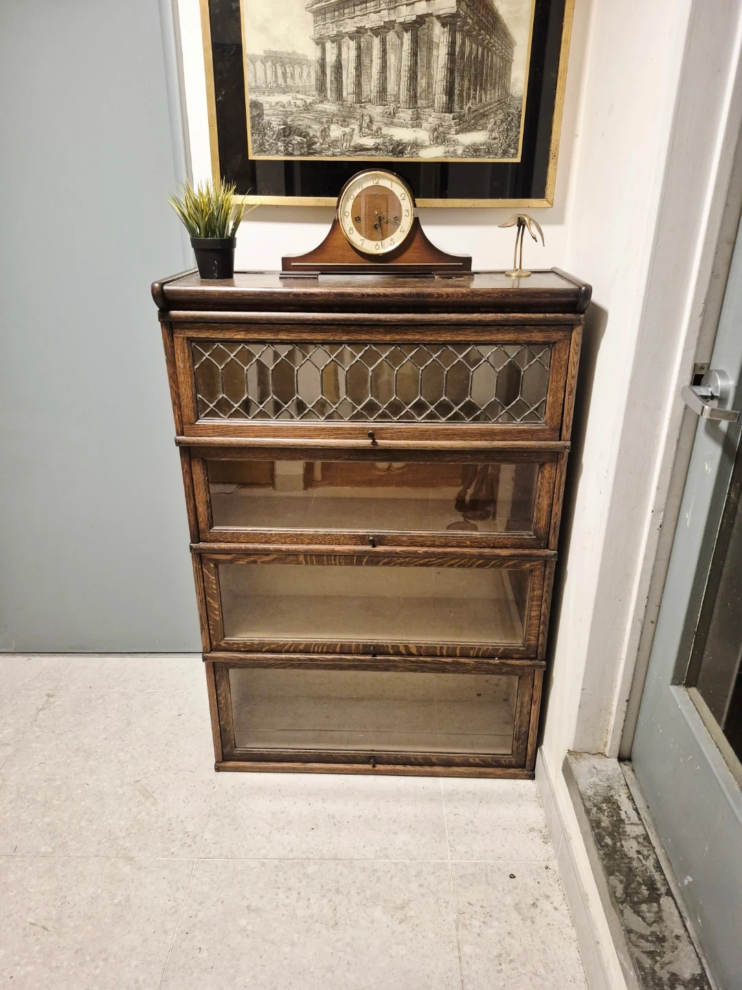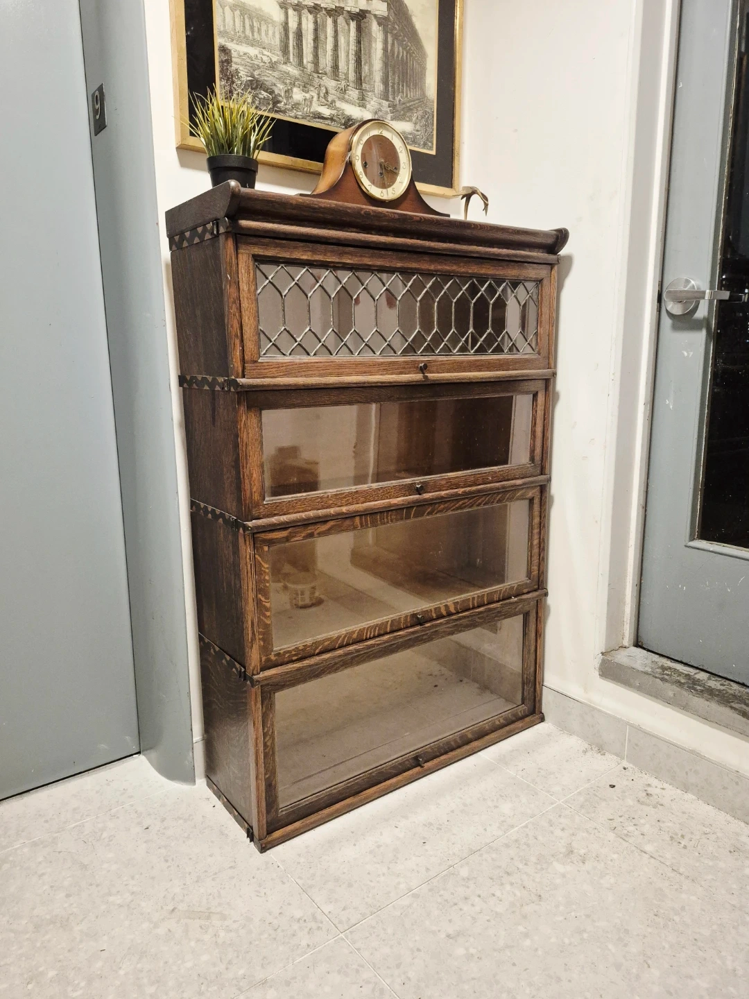 This beautiful antique barrister bookcase is crafted from rich oak wood. It features four stacked sections with glass front doors and intricate patterned glass on the top section. Its classic design makes it a charming addition for displaying books or collectibles. Perfect for a study or living room needing a touch of vintage style!