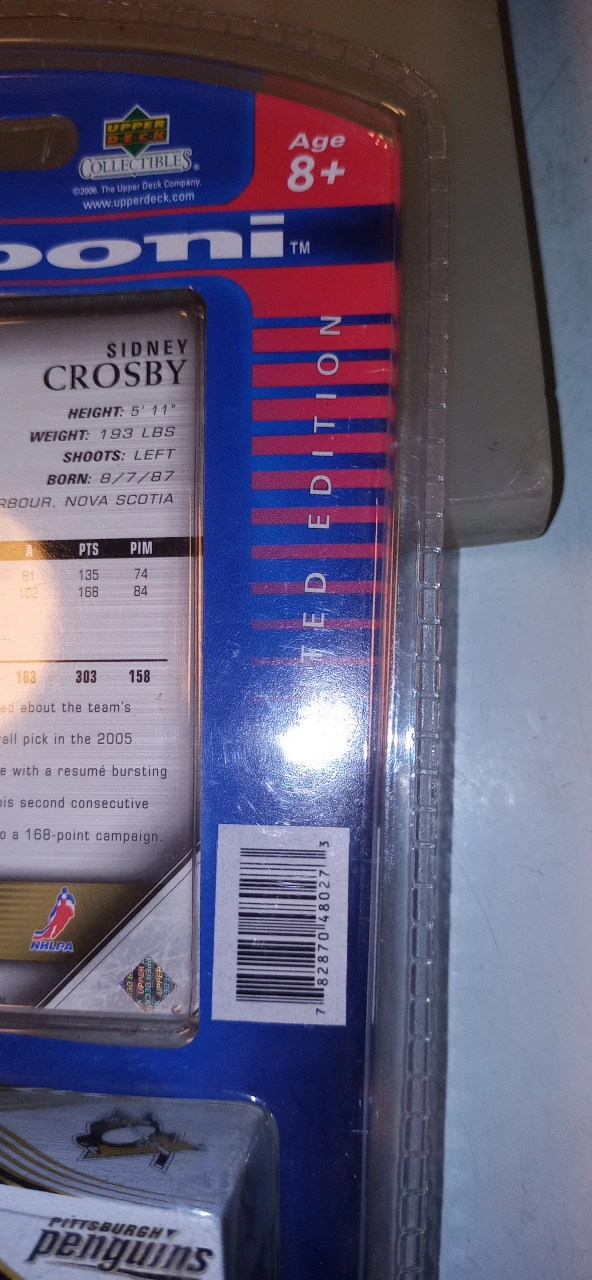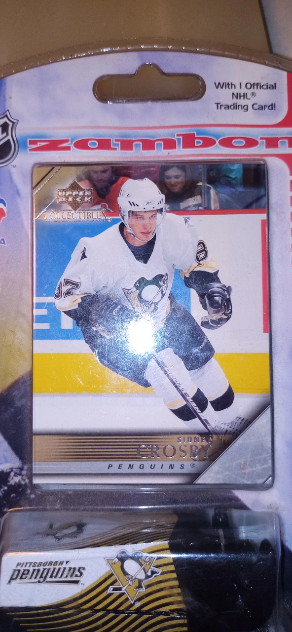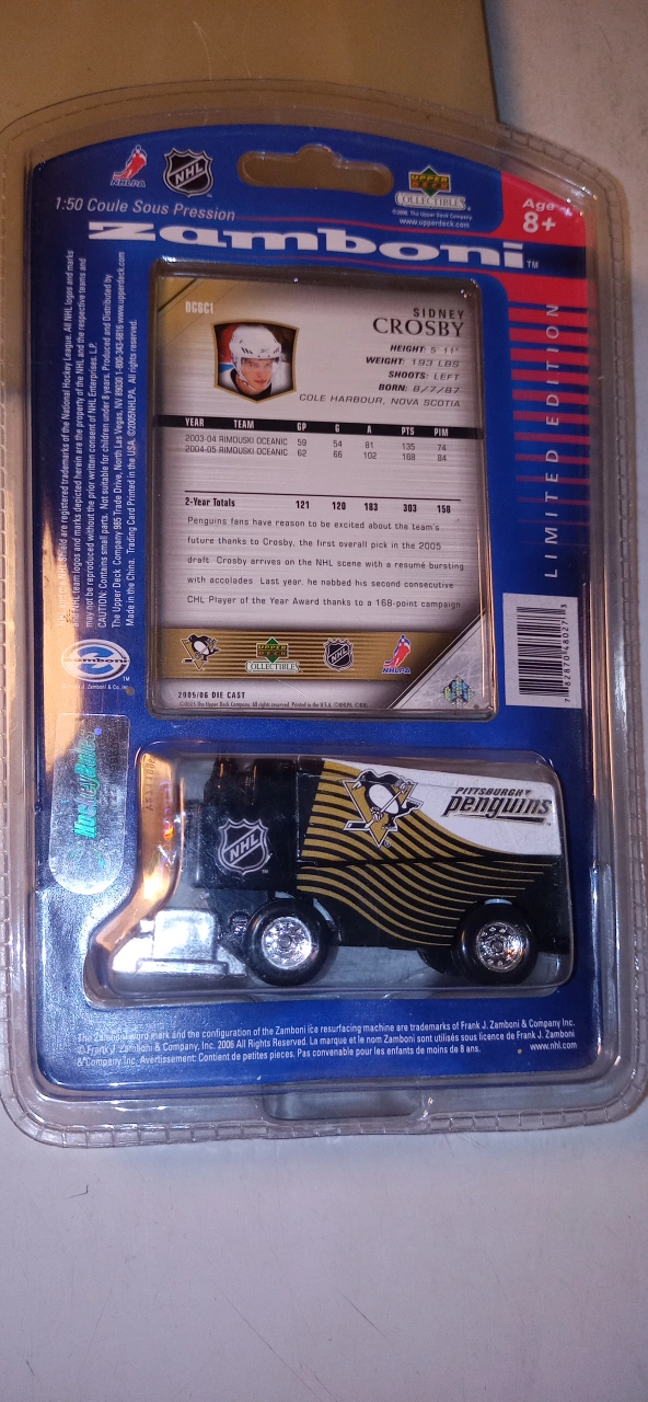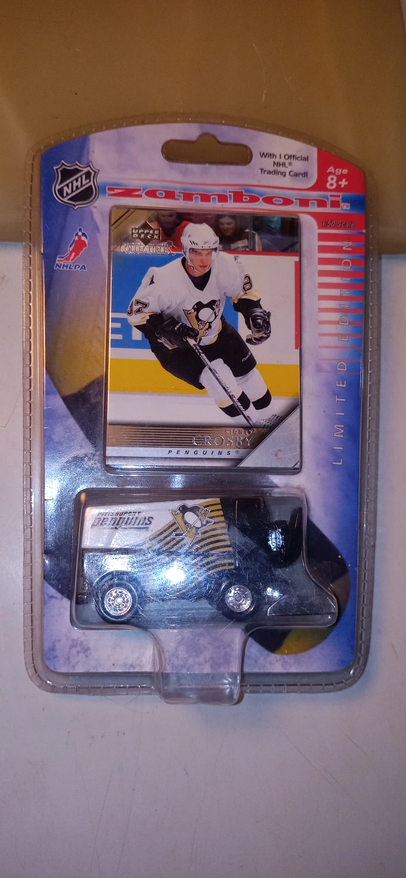 Sidney Crosby card with the Pittsburgh Penguins Zamboni set. It's a limited edition collectible. For ages 8 and up. Never opened. The longer u keep it, the more it's worth. This. is a great price. please compare online