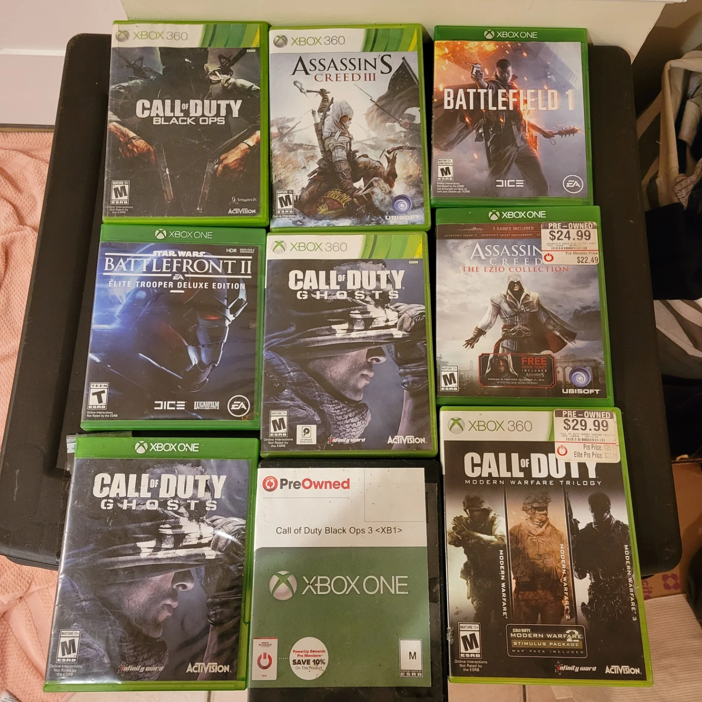 This lot includes several popular video games for Xbox 360 and Xbox One. Games featured are Call of Duty Black Ops, Assassin's Creed III, Battlefield 1, Star Wars Battlefront II, Call of Duty Ghosts, Assassin's Creed Ezio Collection, Call of Duty Modern Warfare Trilogy, and Call of Duty Black Ops 3 for Xbox One.