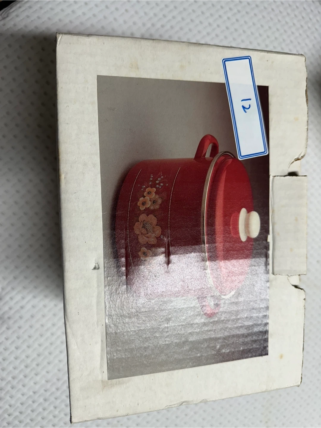 This is a 7-litre enamel pot with a lid. It's made from steel with a stainless steel rim and lid. The pot features a decorative floral design.