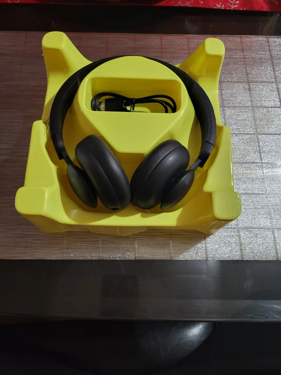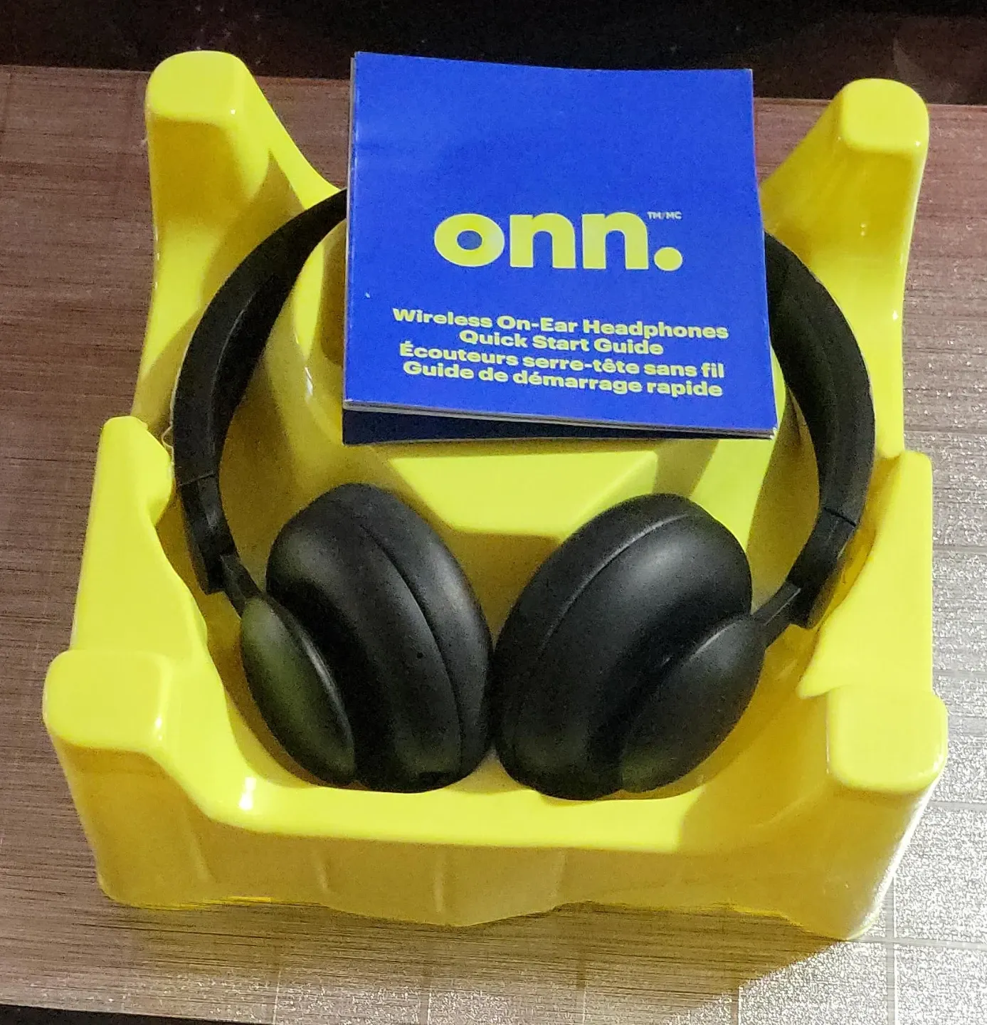 These black Onn. wireless on-ear headphones come with a charging cable. They're great for listening to music or podcasts on the go. Includes original quick start guide.