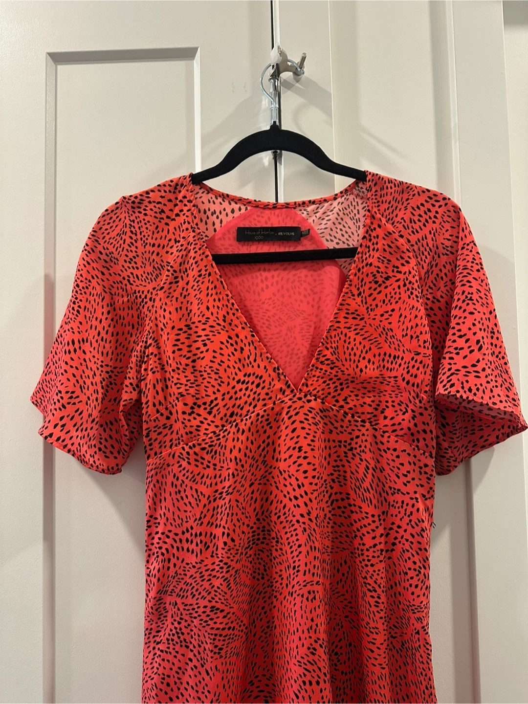 Bright red midi dress with a black abstract print. It features a V-neckline and short flutter sleeves. The hemline is asymmetrical and layered.