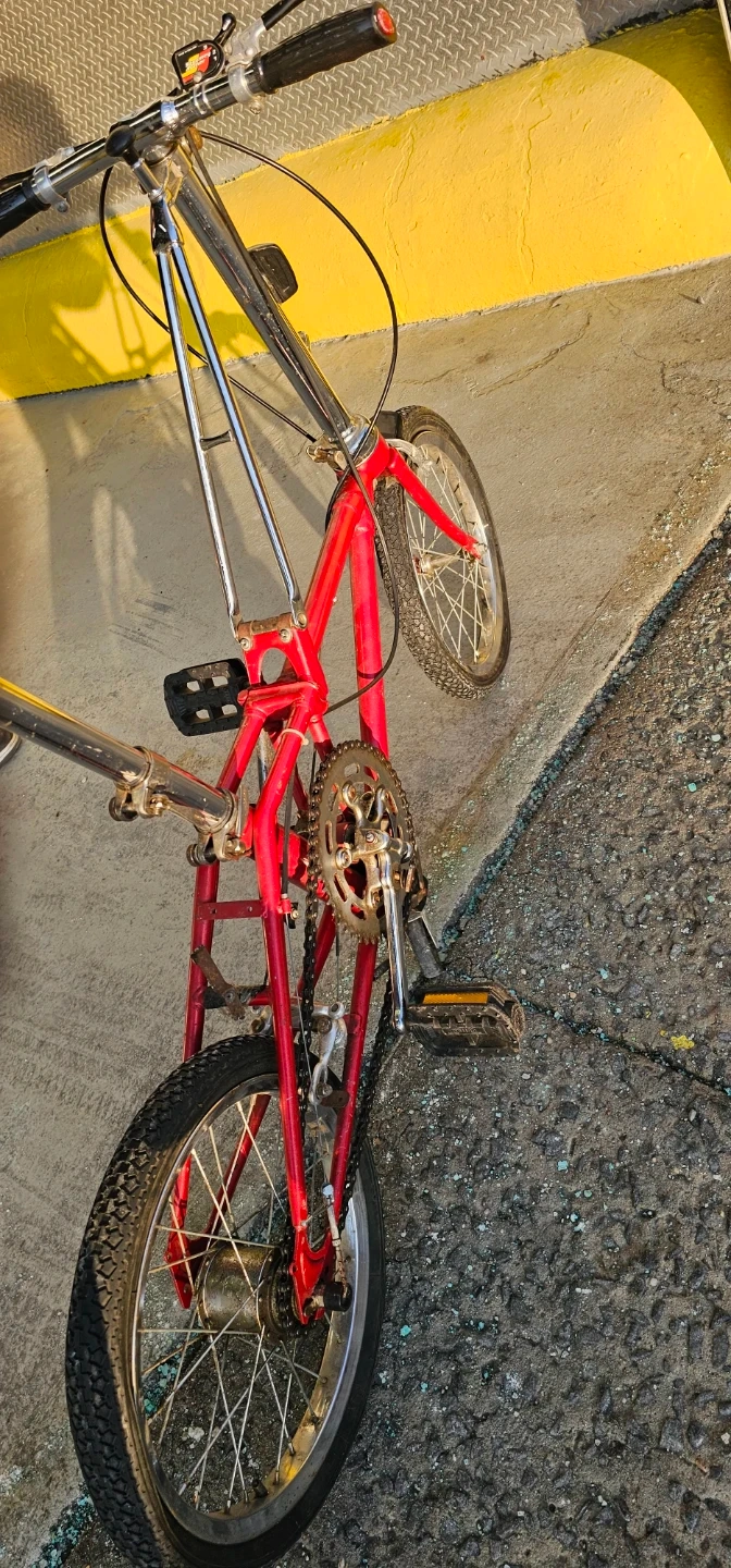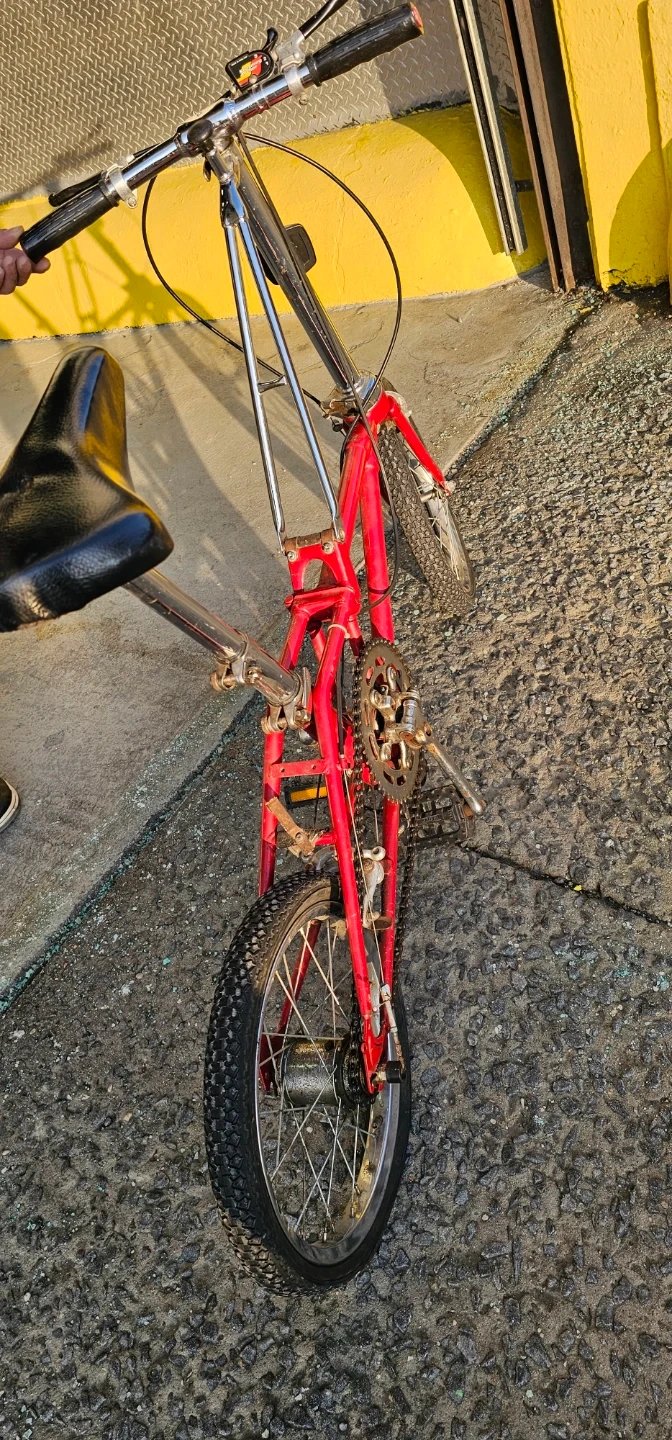 This is a red folding bicycle with easy ride to travel with. It has a chrome frame and handlebars. Folds for easy storage and transport!