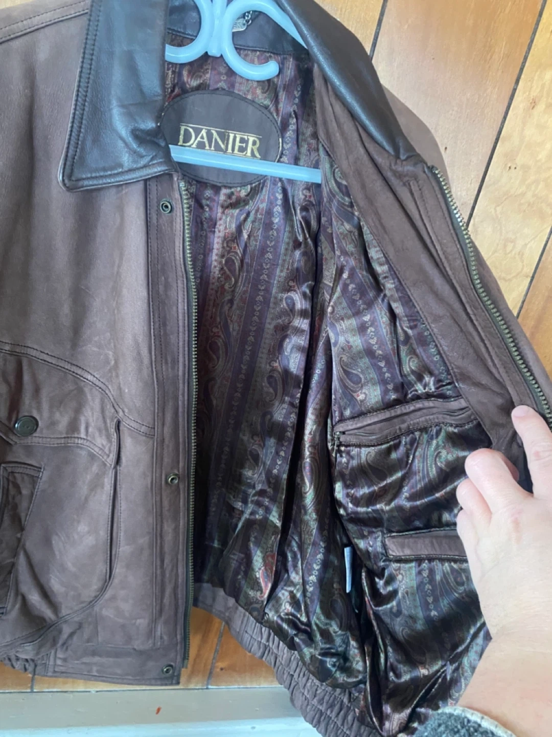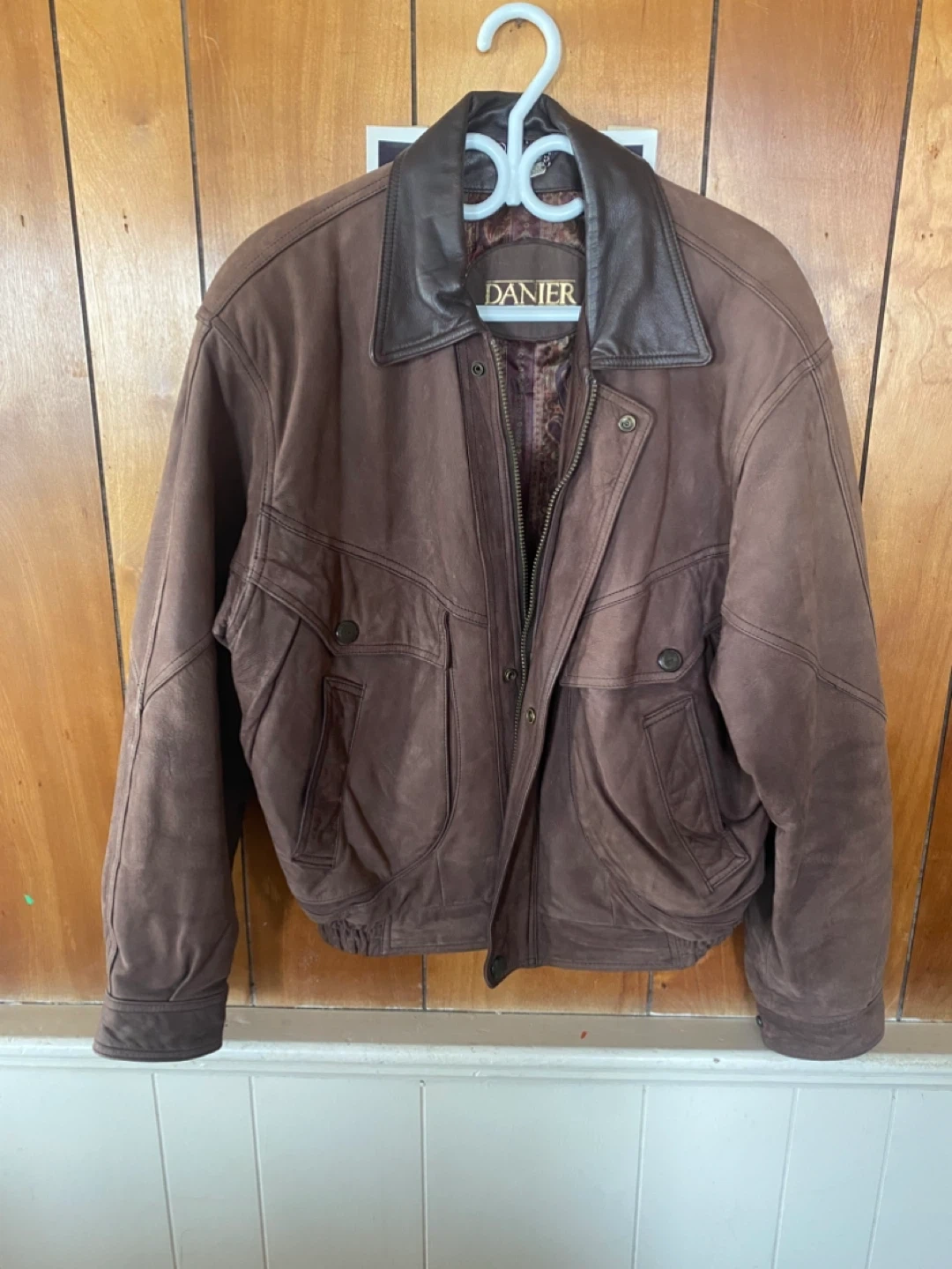 This is a Danier brown bomber jacket, made from suede and leather. It features a patterned silky lining and a metal zipper closure. The size is XS. Great for cooler weather!