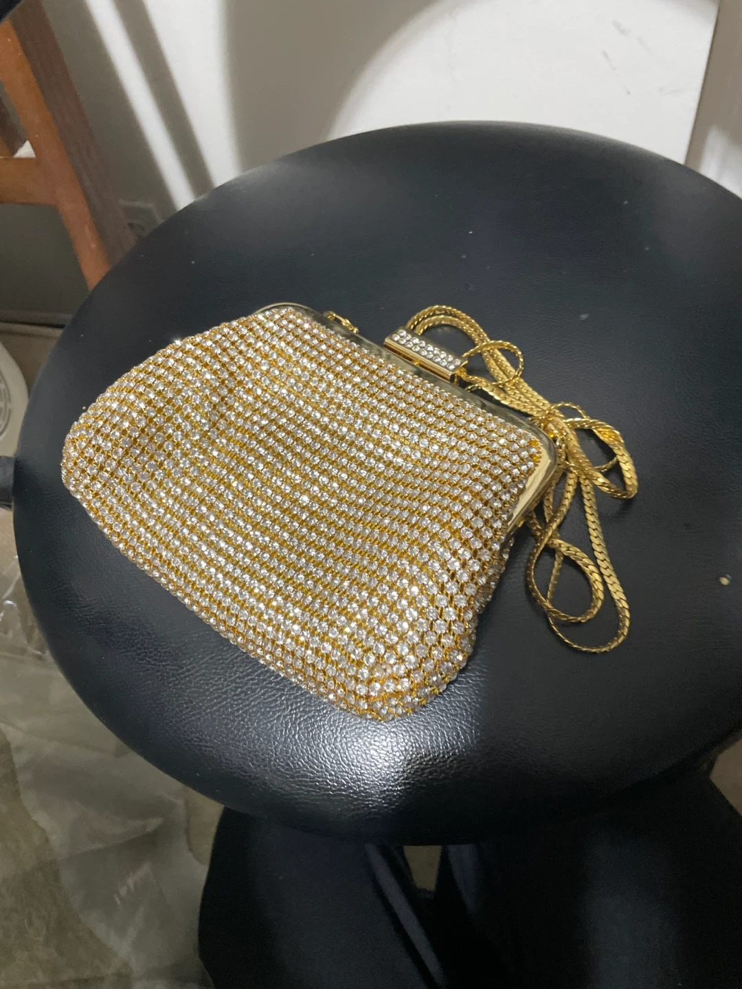 Selling a beautiful gold rhinestone clutch purse. It's perfect for a night out or a special occasion. The clutch has a gold chain strap for easy carrying