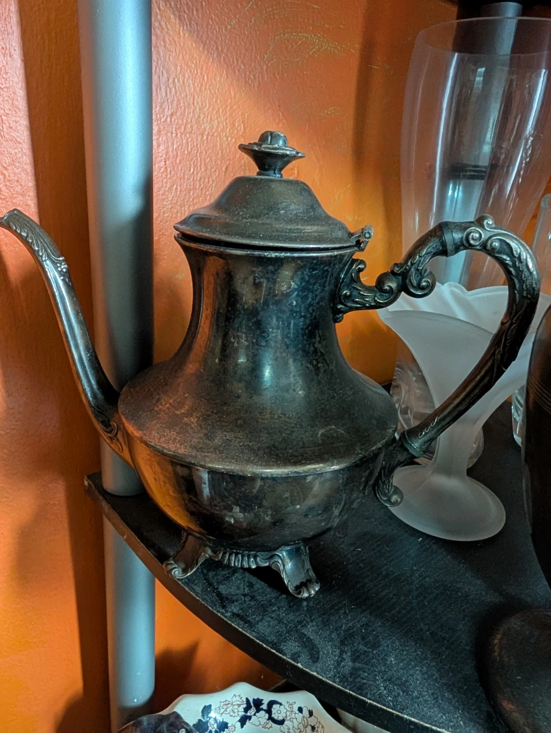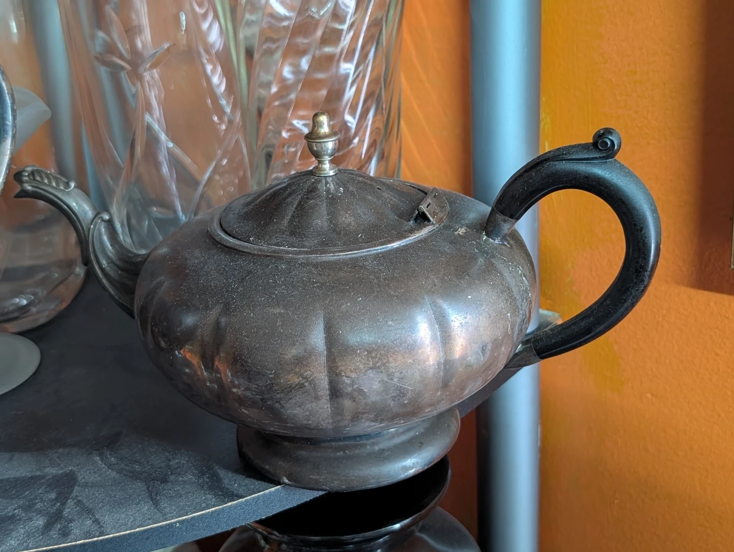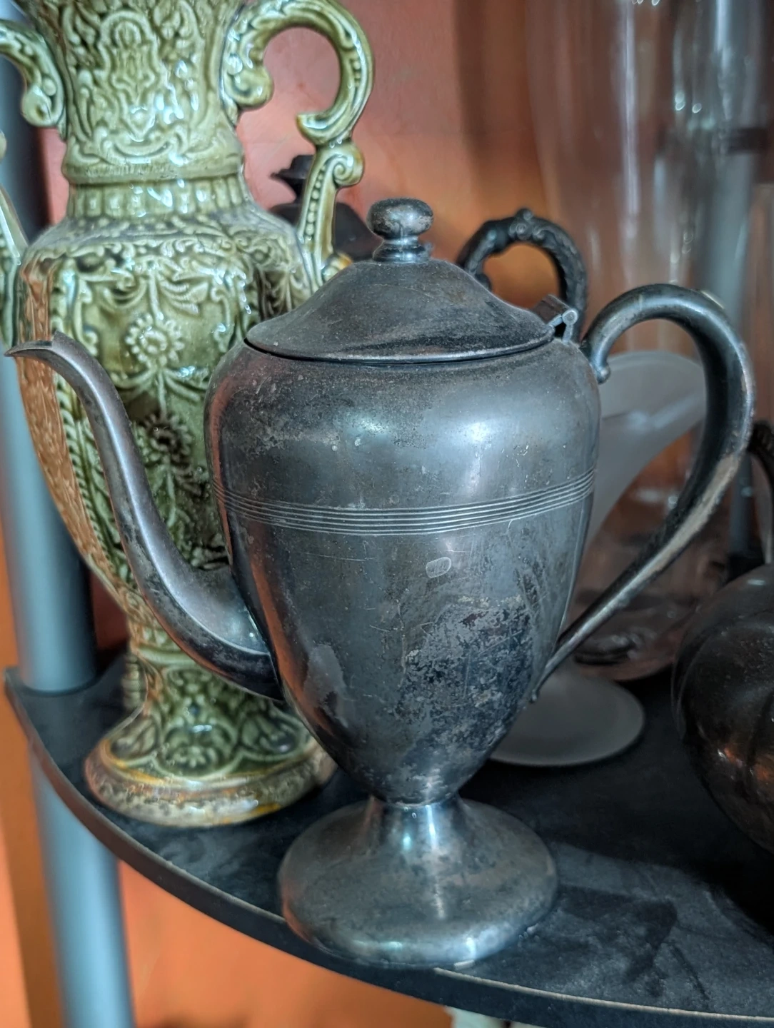 Selling a vintage silver teapot. It has a unique design and could be a great addition to your collection or for everyday use. It shows some signs of wear, which adds to its vintage charm!