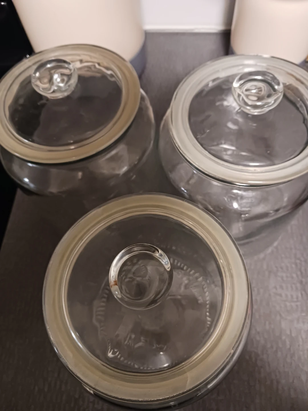 Selling a set of glass kitchen canisters. They come with lids and are great for storing dry goods or other kitchen items. They're in good condition and ready for a new home!