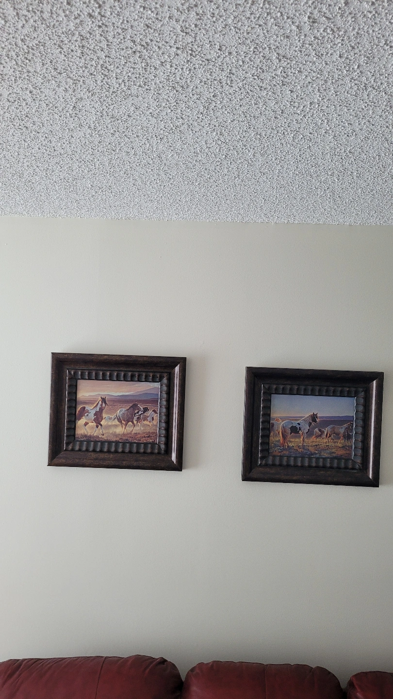 Two matching framed pictures. Dark brown frames. Pictures depict horses in a landscape setting. Great for western or equestrian decor.