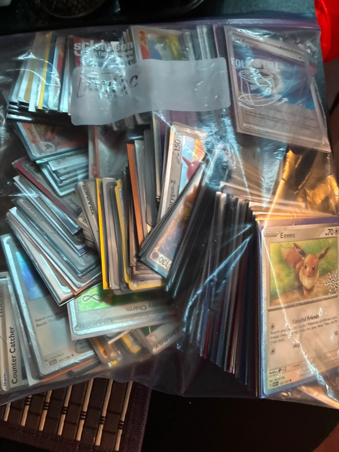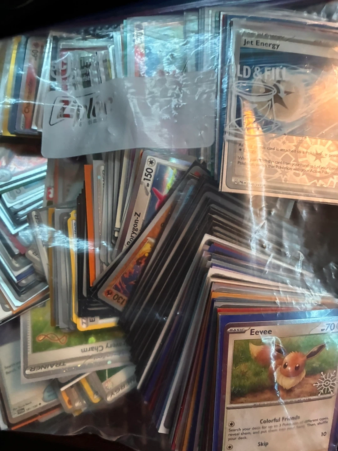 This is a large collection of Pokémon trading cards. It includes various Pokémon, trainer, and energy cards, with some rare ones visible. These cards are great for collectors or players looking to expand their decks. They are stored in a sealed bag. Sold as a hole thank you 😊