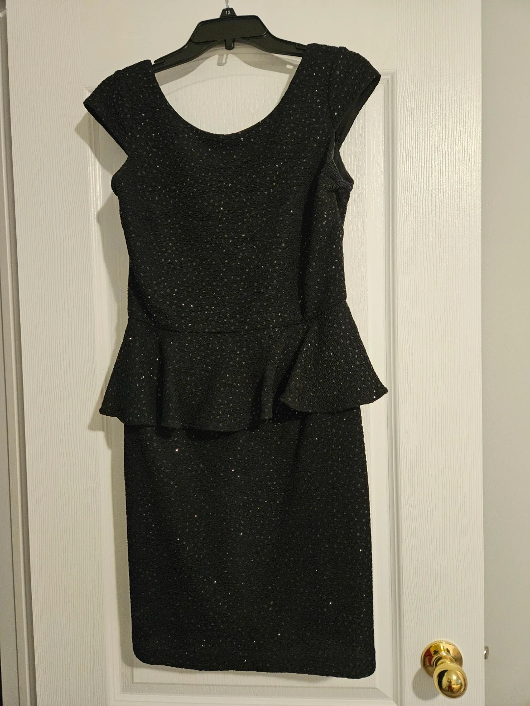This Hailey by Adrianna Papell dress is black and features a sequin design. It has a peplum waist and short cap sleeves. Dress size is US/CAN 10.