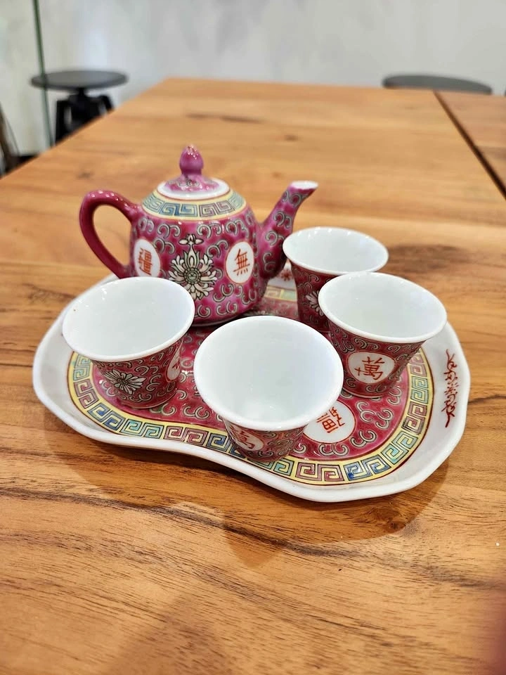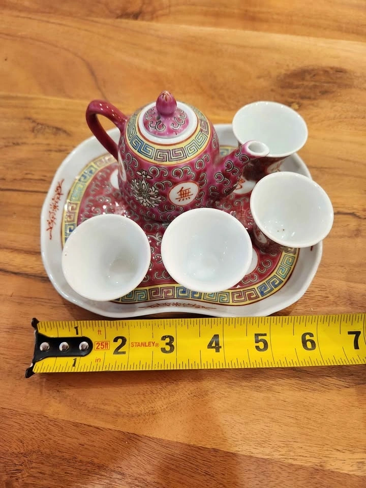 Vintage Jingdezhen Mun Shou Longevity teapot and sake set in Rose, red porcelain. Features the "Mun Shou" (longevity) pattern.
