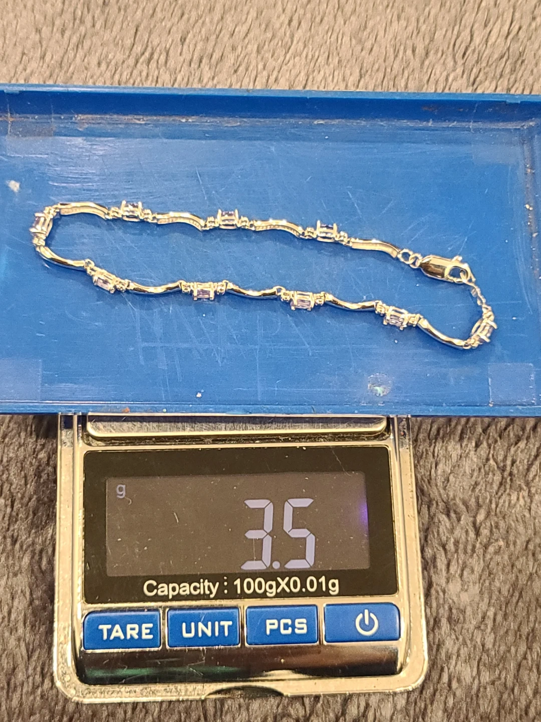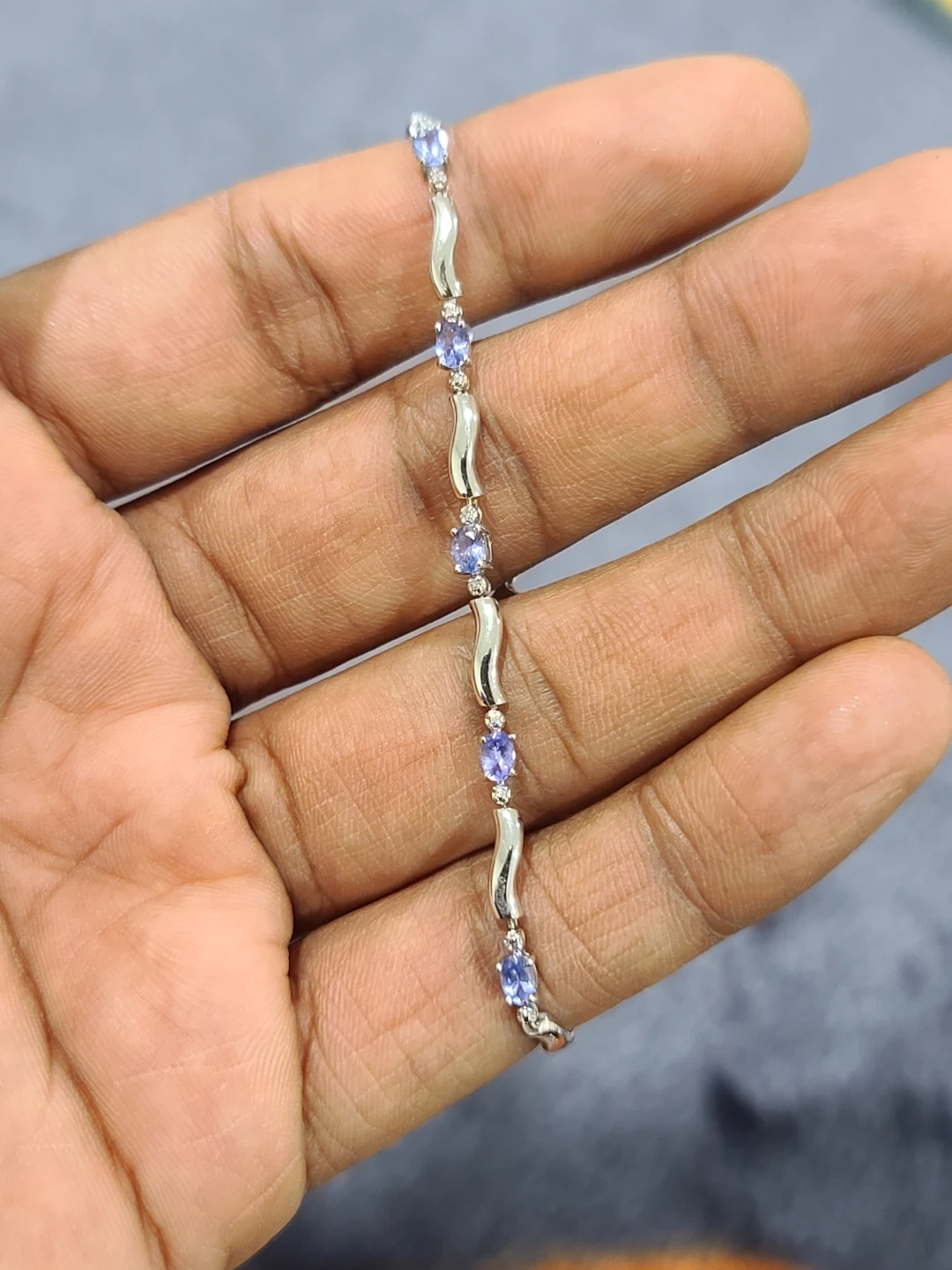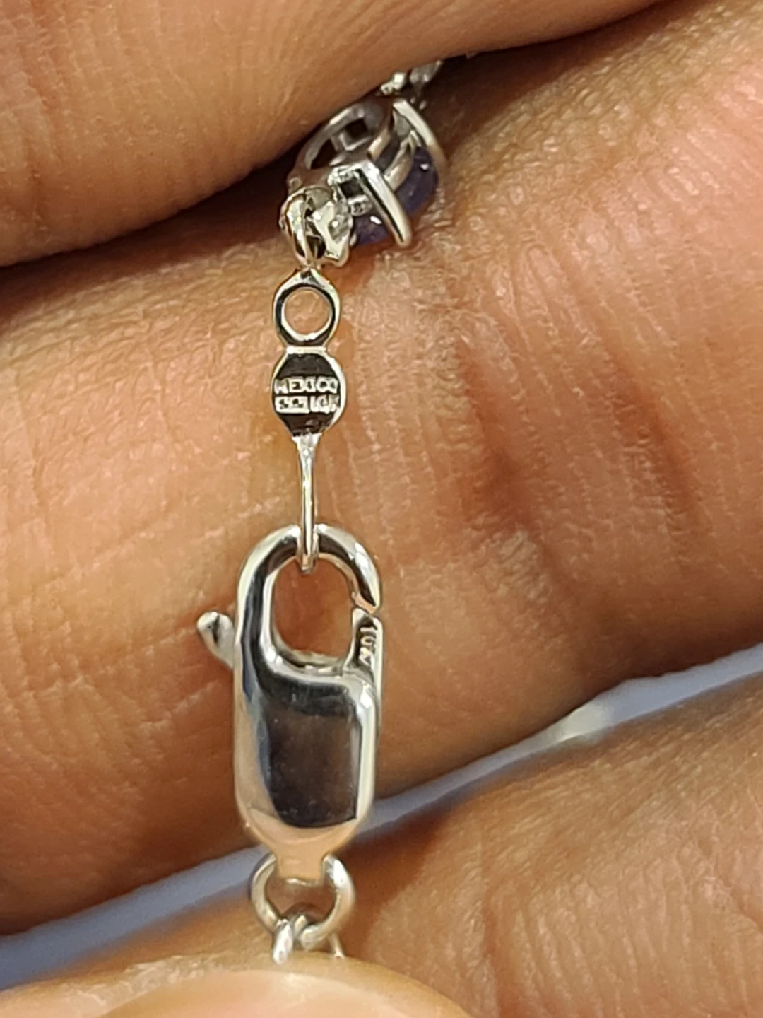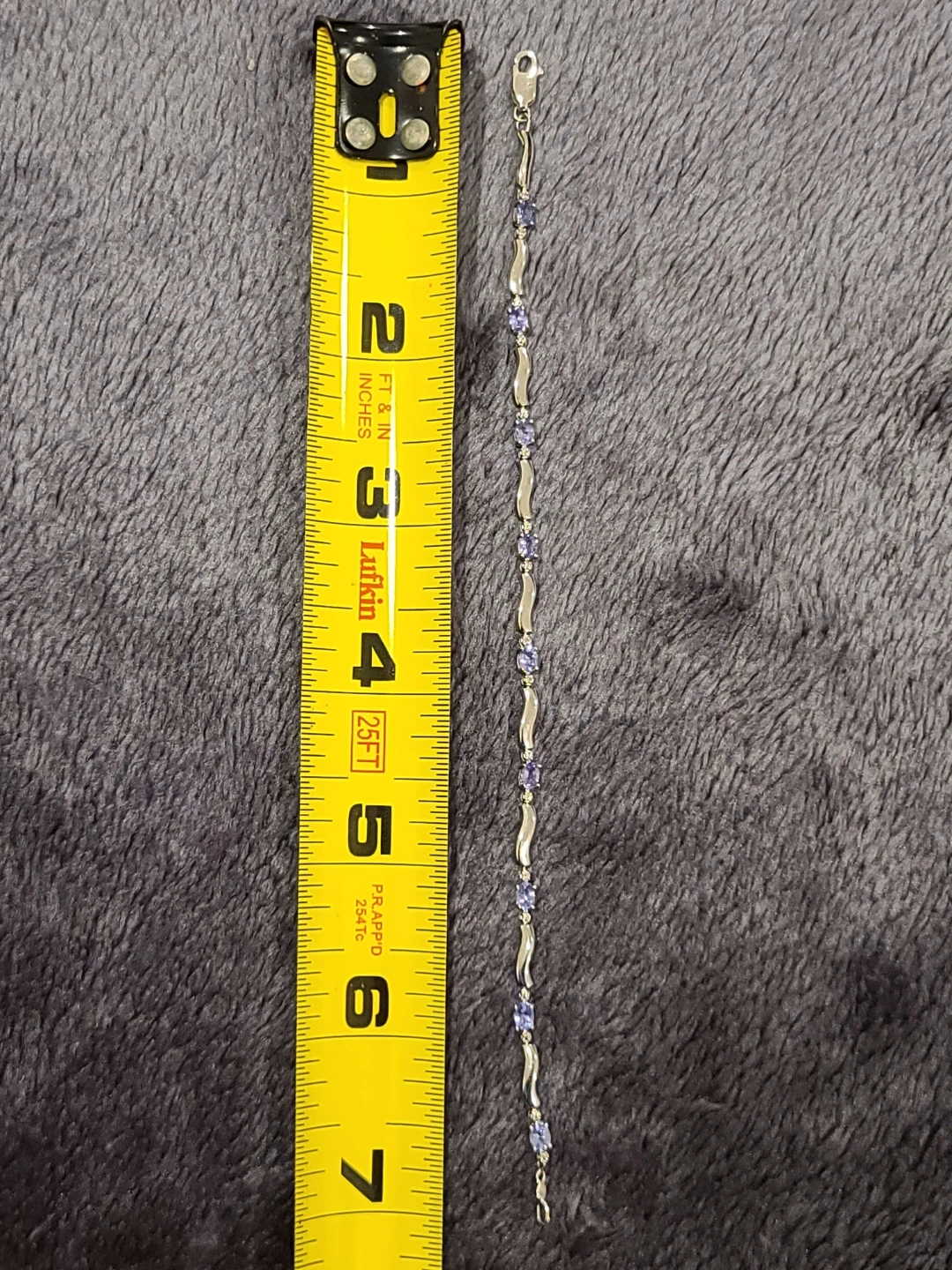 This 10k white gold bracelet features a wave design with small purple tanzanite stones and diamond accents. It has a secure lobster clasp closure and weighs 3.5 grams. Perfect for adding a touch of sparkle to any outfit! 7inch Long