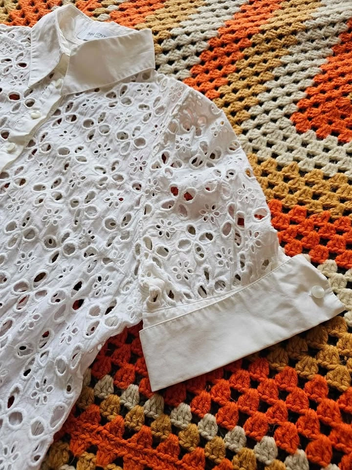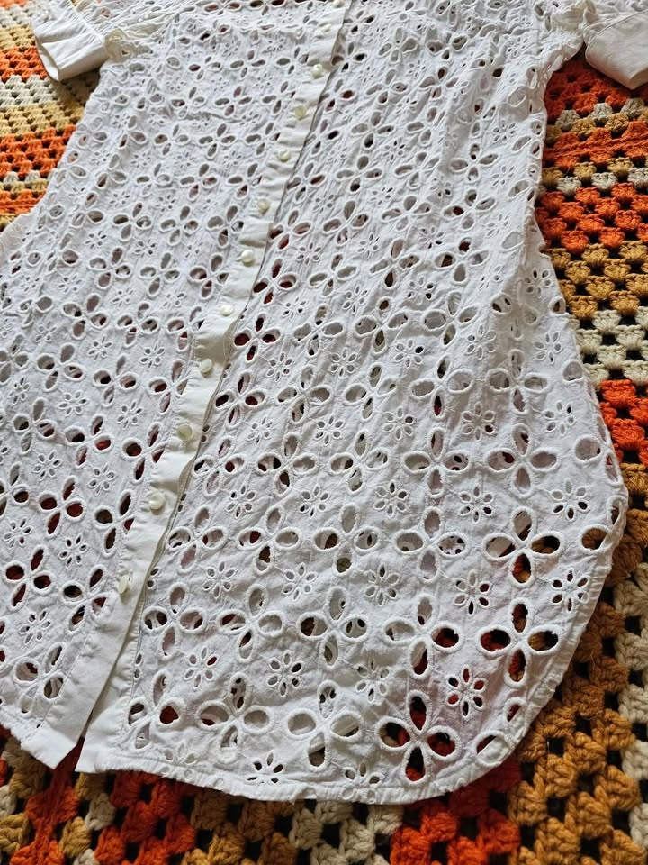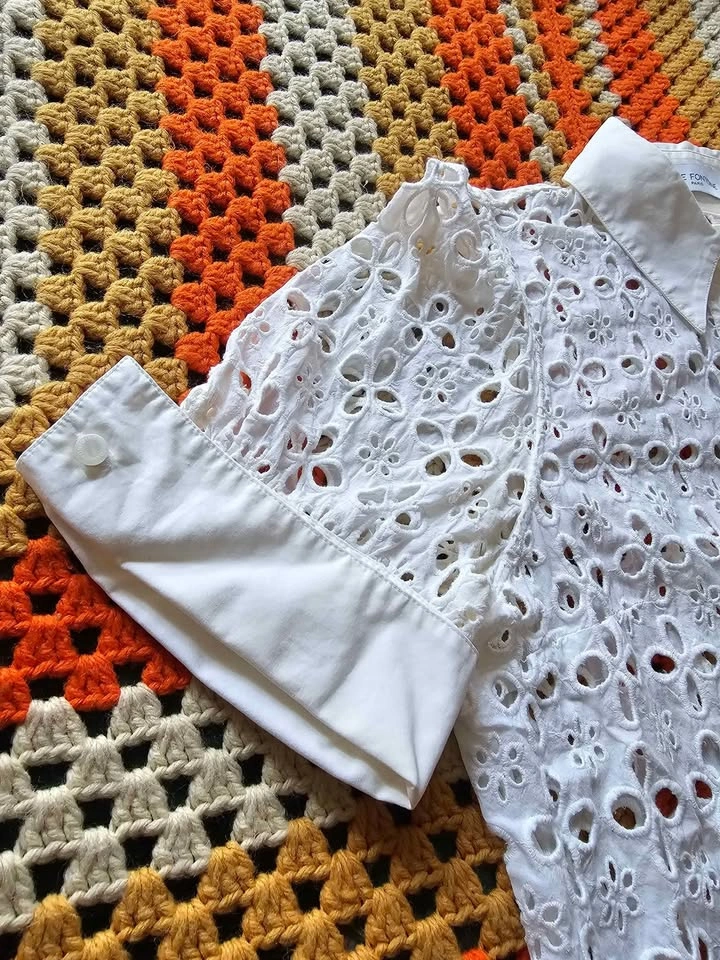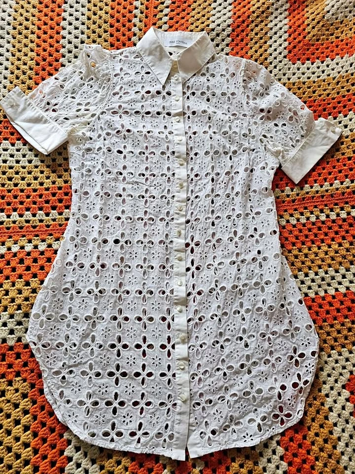 Beautiful button down short sleeve Saline shirt dress from luxury Parisian designer Anne Fontaine. Dress has a crisp collar and sleeve cuffs, and is made of elegant white eyelet lace in a subtle but feminine pattern. Perfect for old money aesthetic European looks. Dress buttons with mother of pearl style buttons that all have an embossed logo. This is a timeless and classic look that will never go out of style.