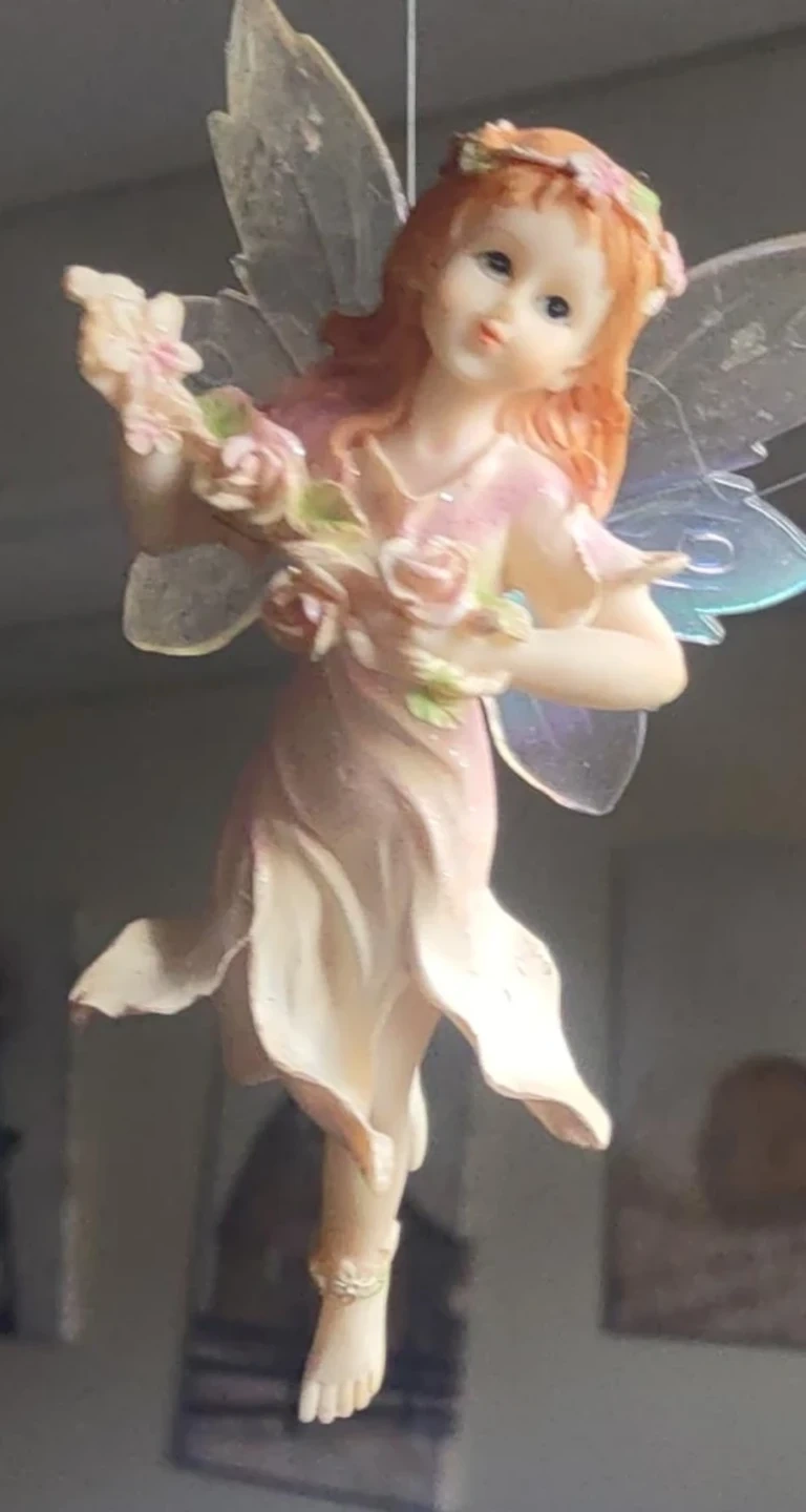 Decorative fairy figurine wearing a pink dress and holding a bouquet of pink roses. Wings are translucent and iridescent. It's a lovely piece for display.(She also looks like she's flying once she's hung up)