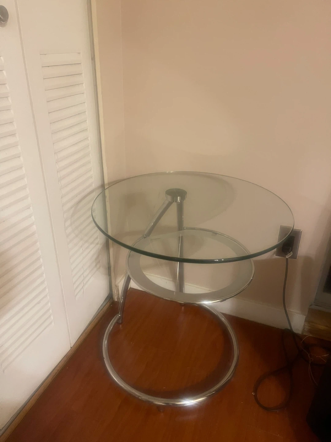 This is a stylish side table with a round glass top and a chrome base. It has a second glass shelf for extra storage. Its sleek design makes it a great accent piece for any room.