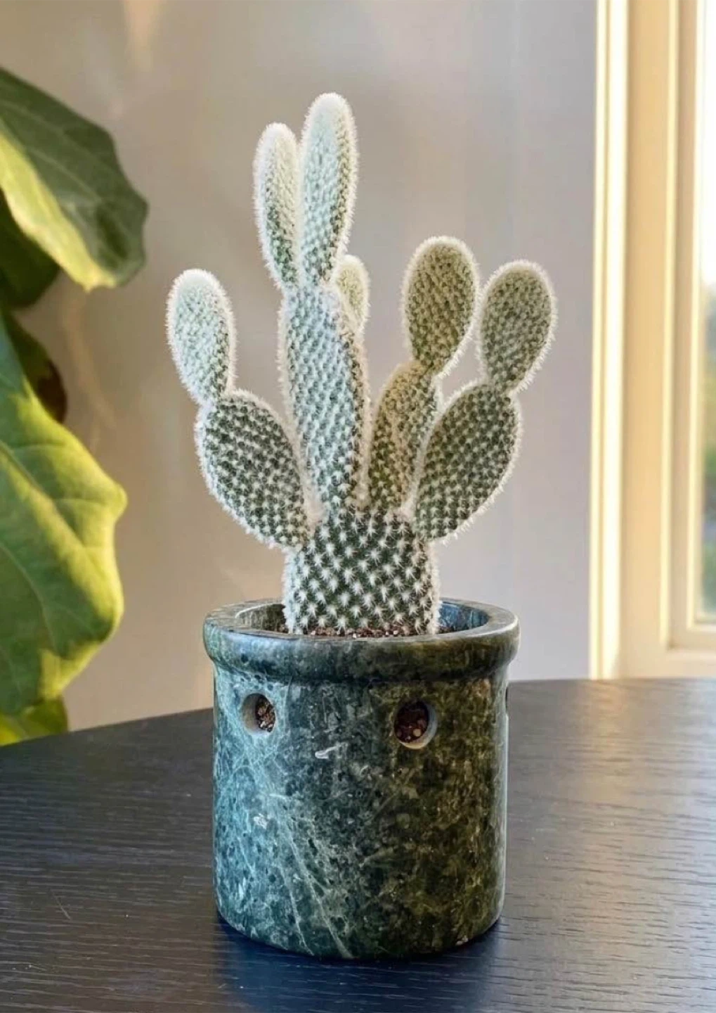Carved from heavy green marble. It's a decorative piece that adds ambiance. Perfect condition. Does not include cactus.