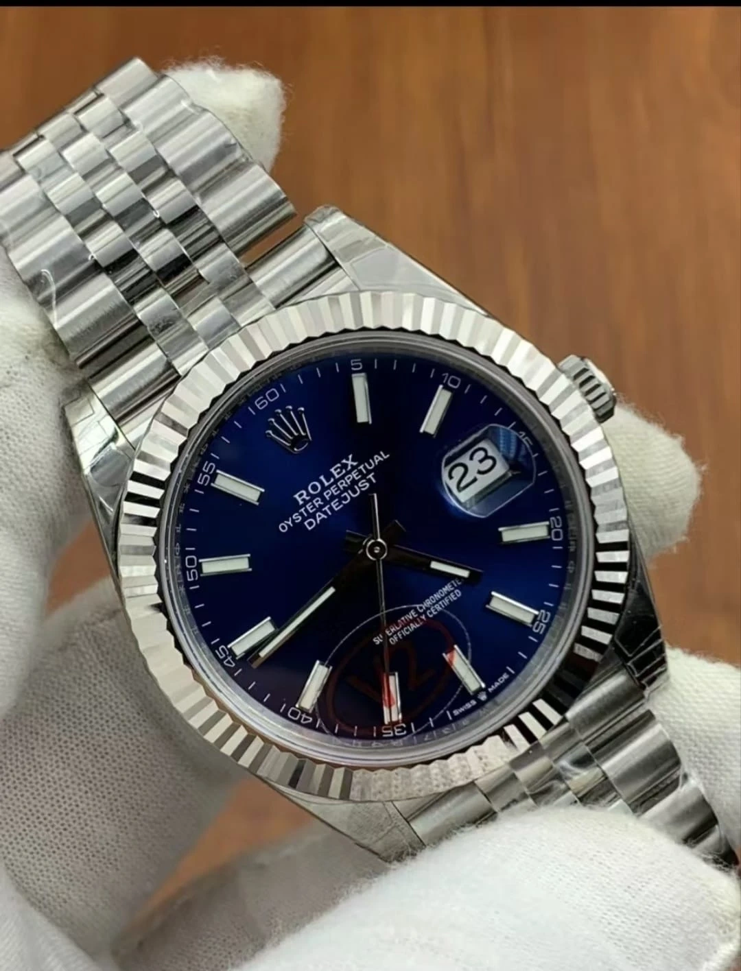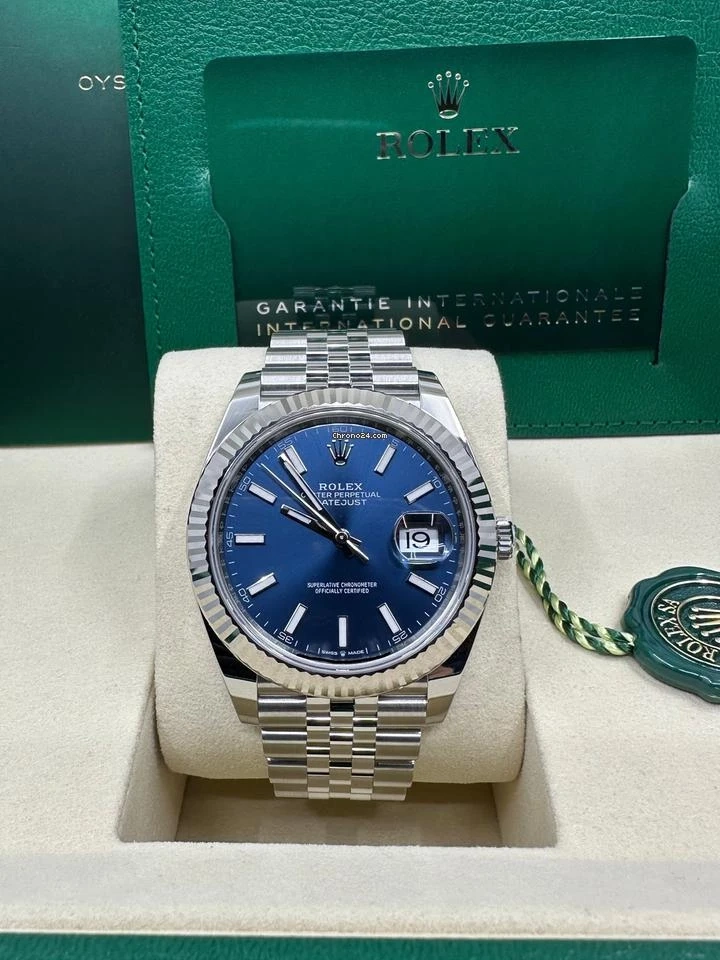 This is a Rolex Oyster Perpetual Datejust watch with a blue dial. It's made of stainless steel and features a fluted bezel. The watch comes with its original box and international guarantee card.