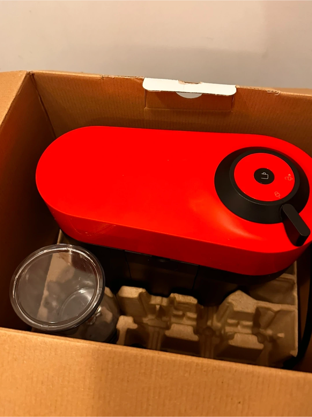 This is a compact Nespresso Vertuo Pop+ coffee machine in red. It's designed for single-serve coffee and espresso. Includes a clear glass mug with extra brand new water tank
